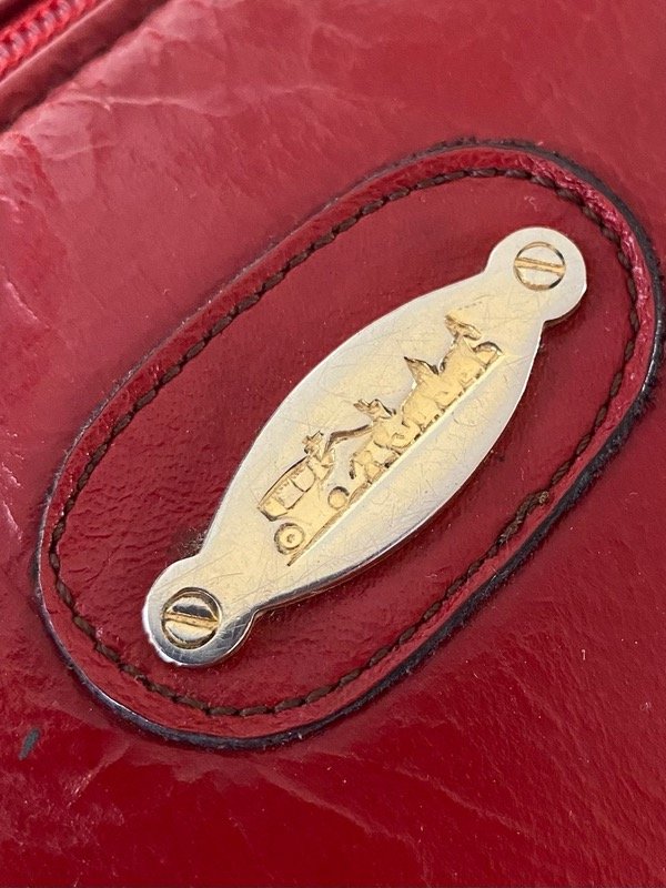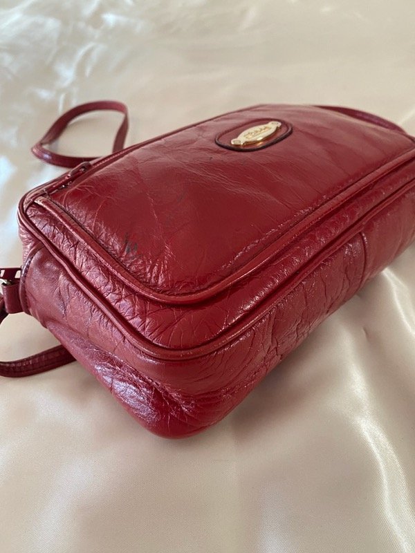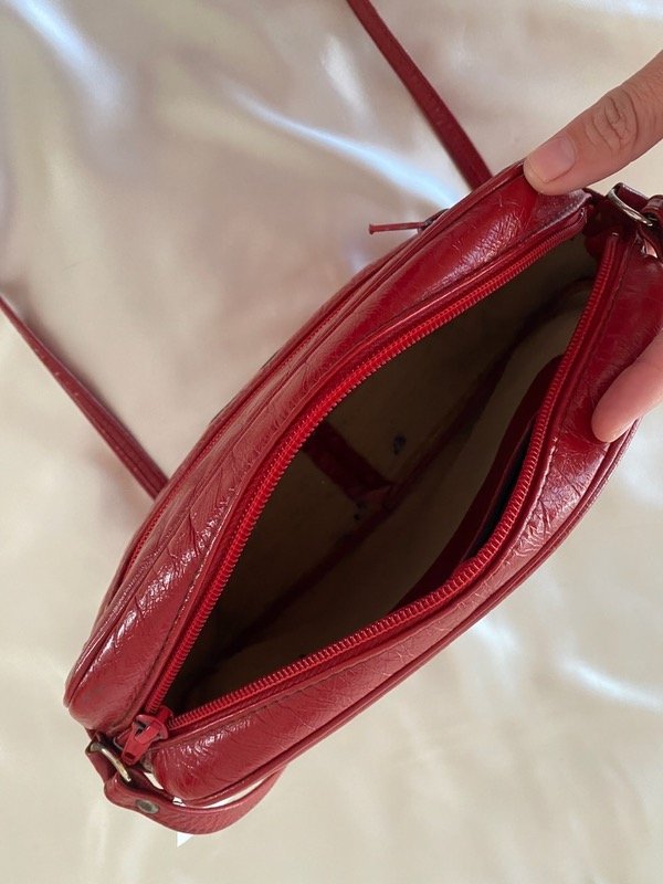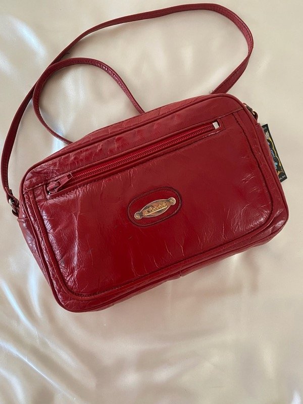Cartera vintage acharolada color rojo profundo, con 2 cierres exteriores y uno interior, con correa larga