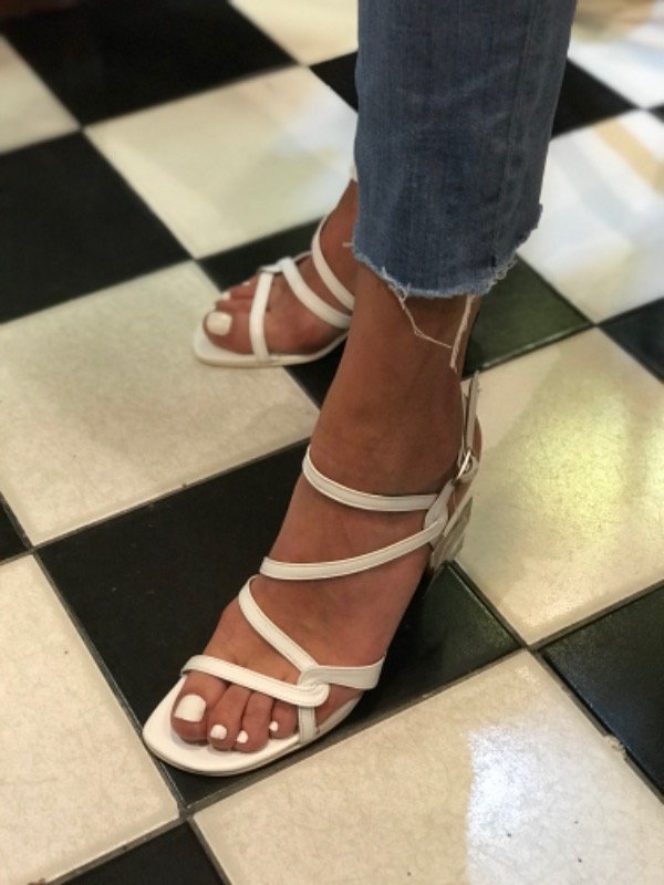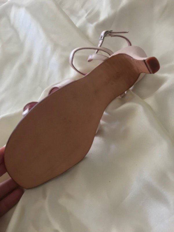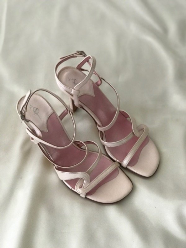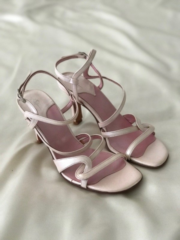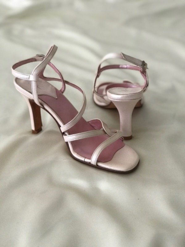 Sandalias de tiritas originales de los años 2mil sin uso, de cuero rosa satinado, taco de 8cm