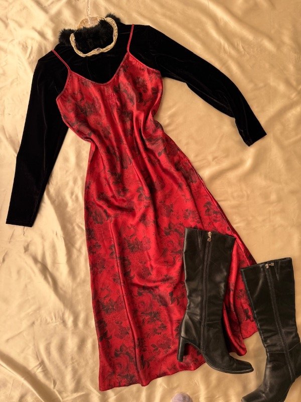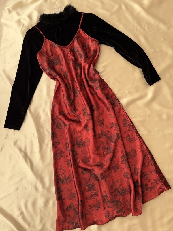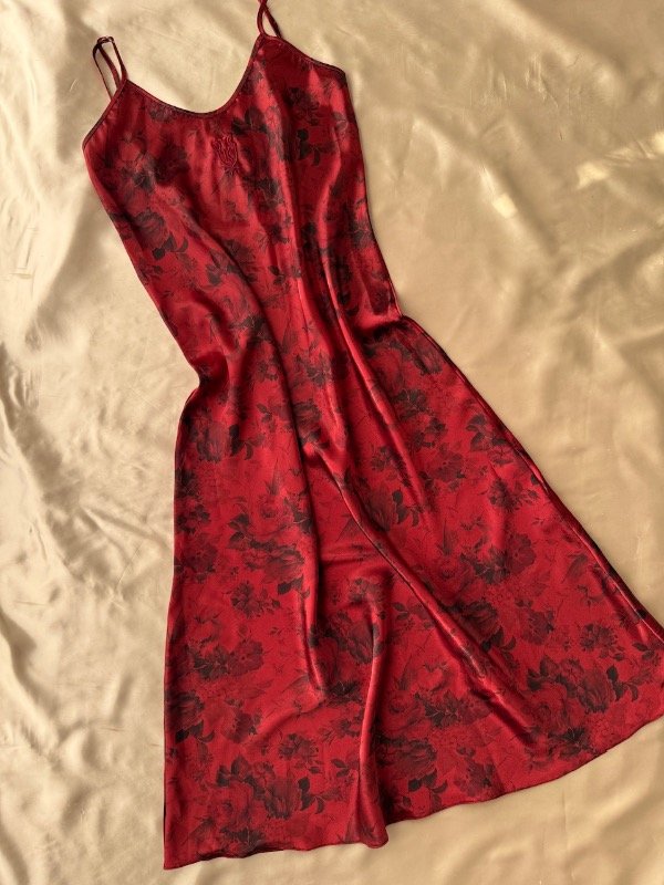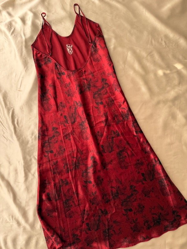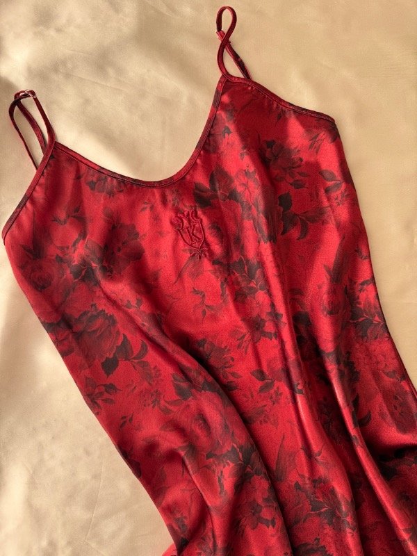 Camisón ideal para usar de vestido lencero, tela rascada estampada color rojo y bordado en frente, tiritas regulables