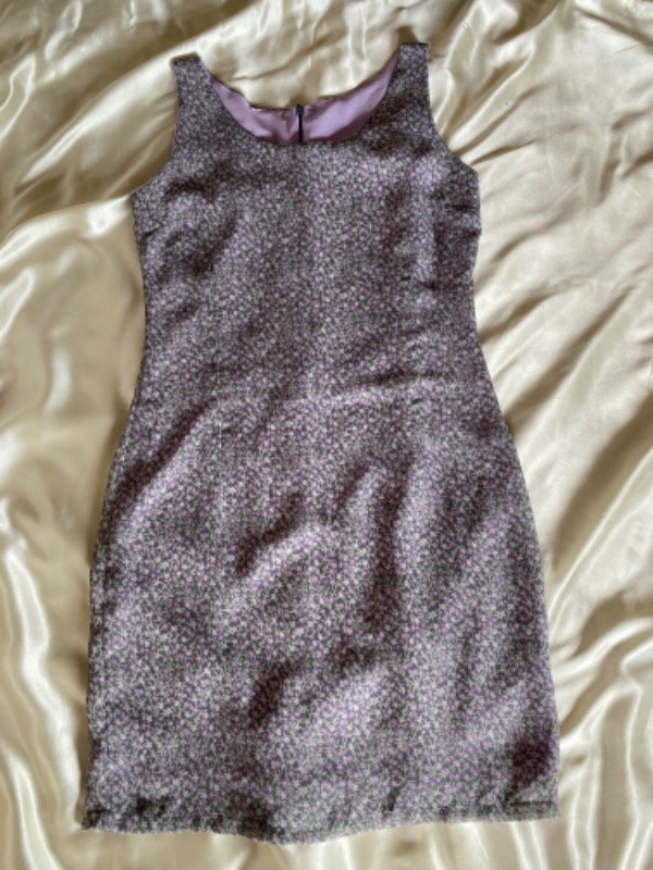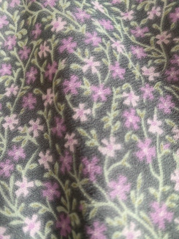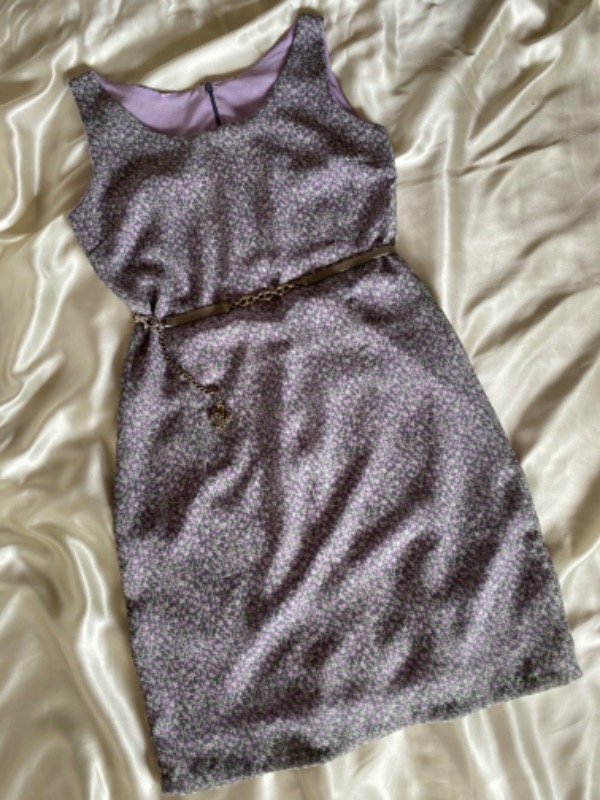 Vestido de gasa forrada color gris con mini florecitas lilas y verdes, cierre en espalda