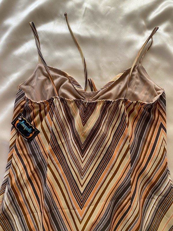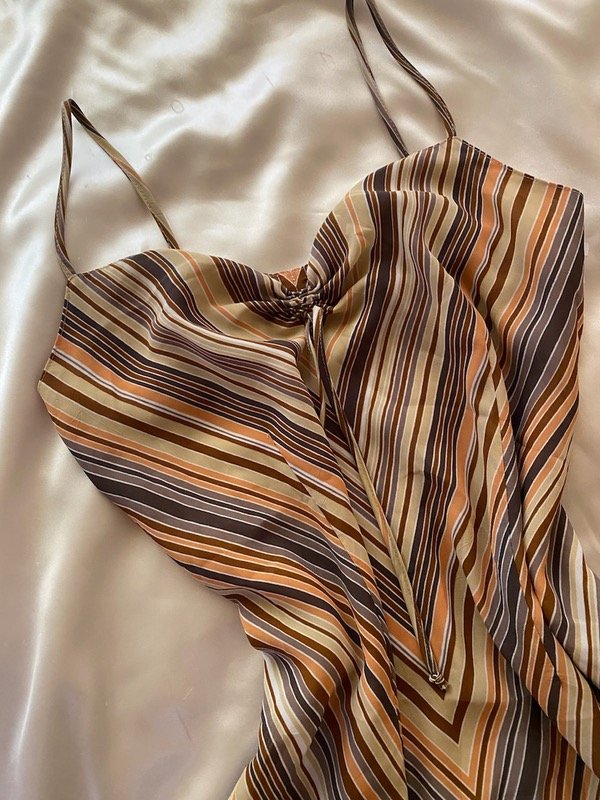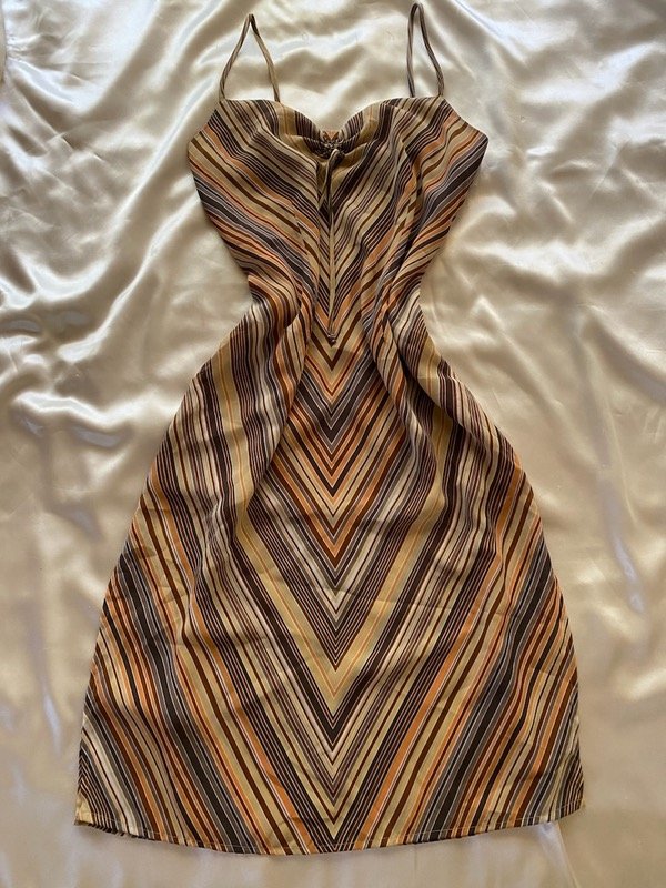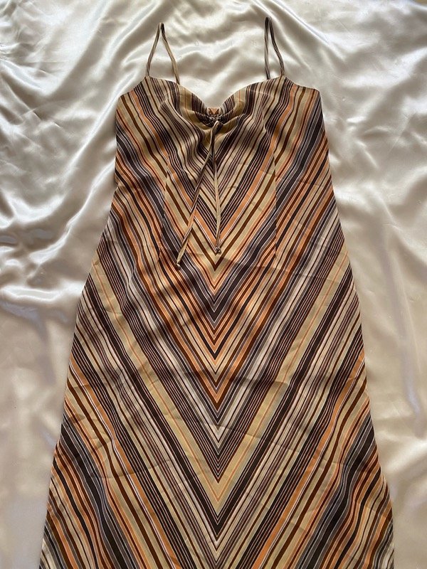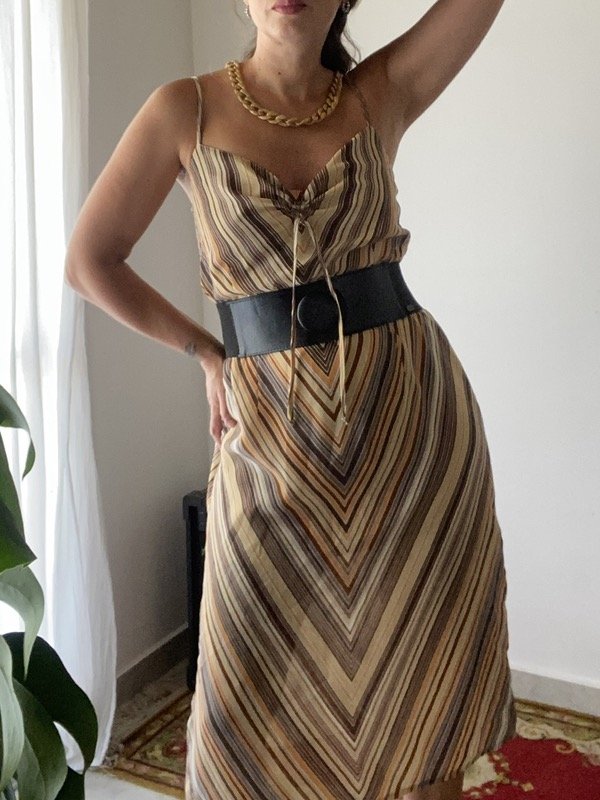 Vestido vintage rayado de tiritas, forrado, con ajuste en el medio del busto, con cierre invisible de costado, elástico en espalda, corte evasé y dos tajos laterales talle 44 según etiqueta , no es elastizado