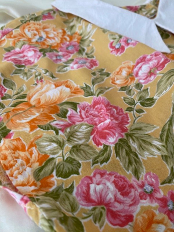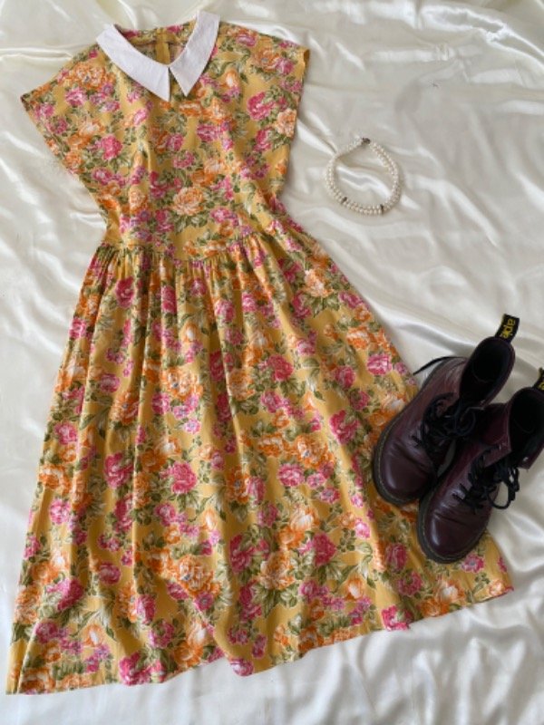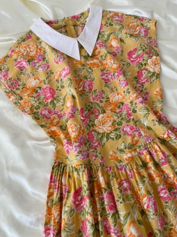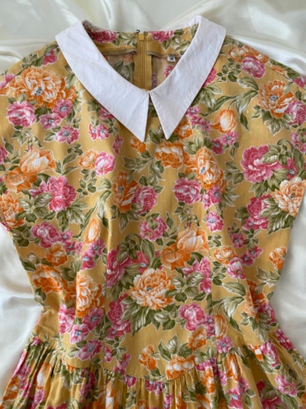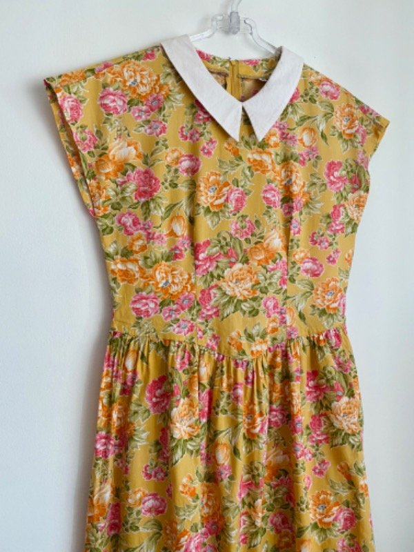 Vestido vintage de poplin estampado con cuello tipo Merlina y cierre en espalda, corte en V en la cintura después todo pinzado, manga tipo japonesa, talle M