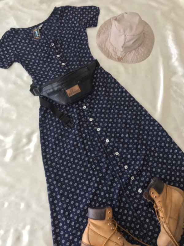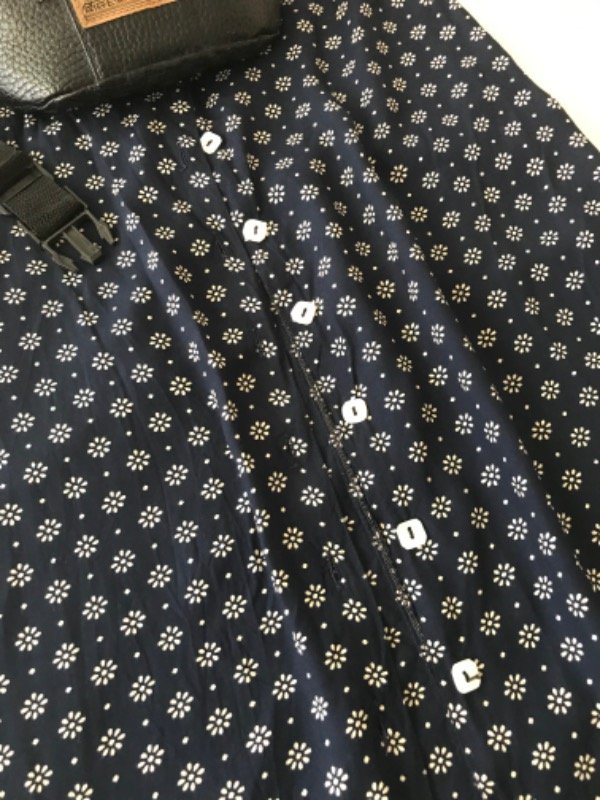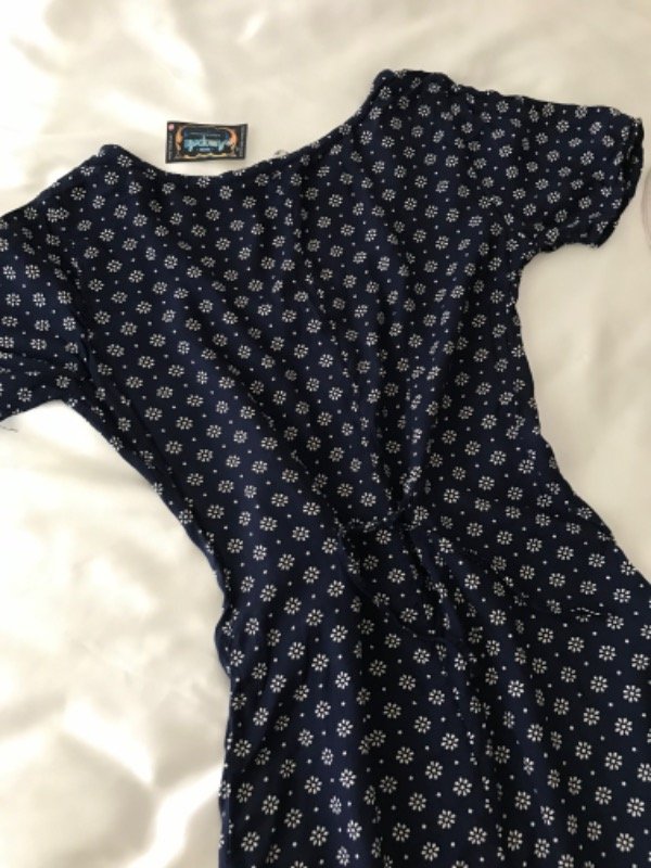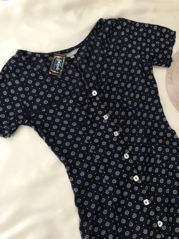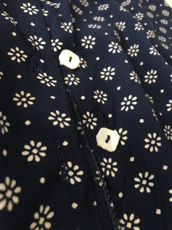 Vestido vintage muy muy largo azul marino con mini margaritas, abotonado hasta el final con botones de nacar artesanales (todos irregulares) cuello redondo amplio y manguitas, 100% rayon talle S