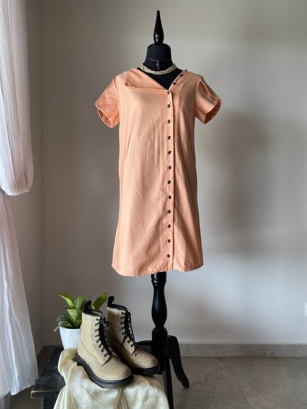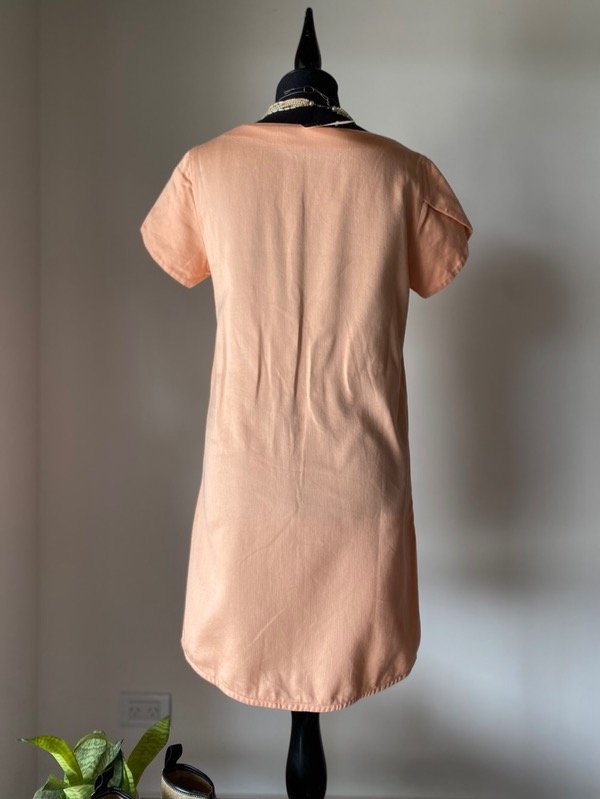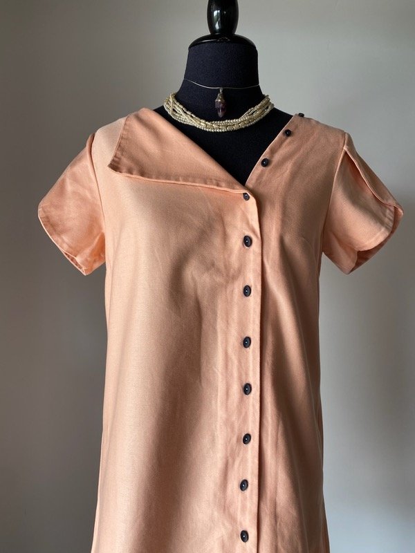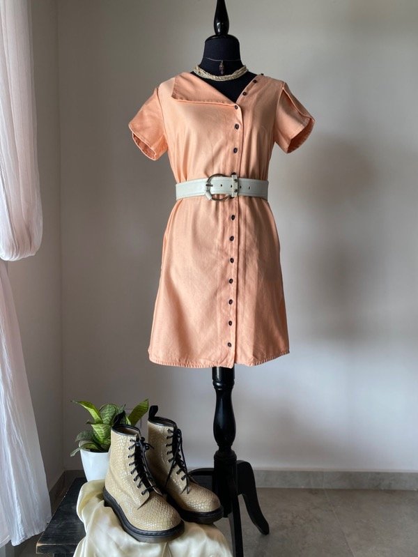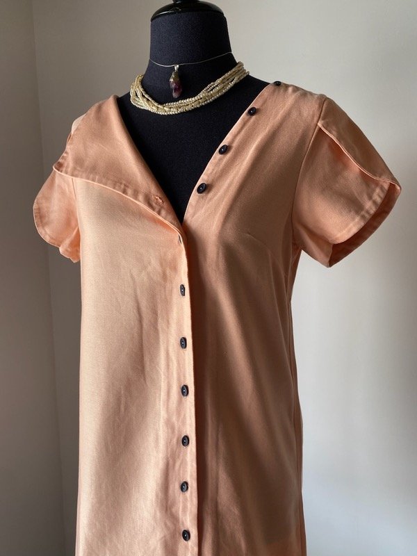 Vestido vintage de gabardina salmón , abotonado de costado, bellos detalles en sus manguitas, recto, largo a la rodilla
