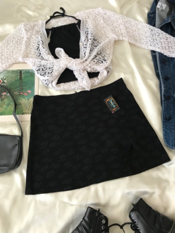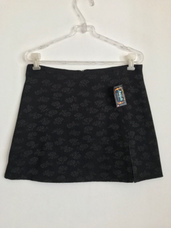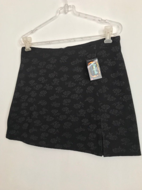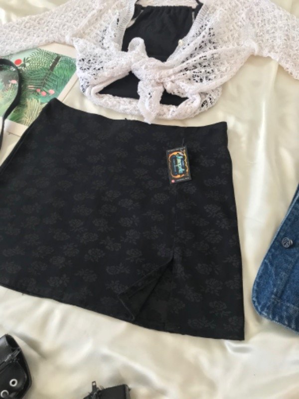 Mini falda negra estampada, elastizada con tajito al frente y cierre atras