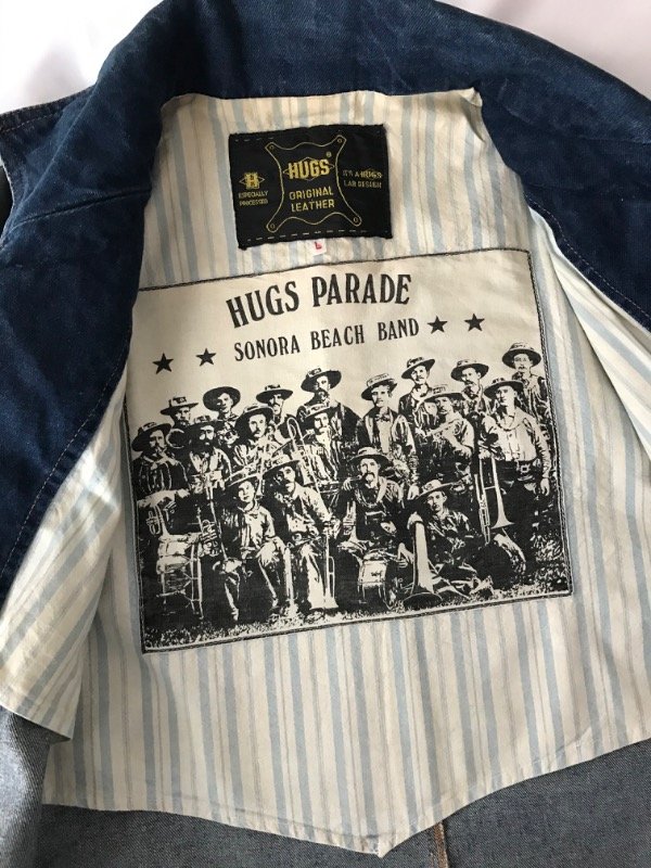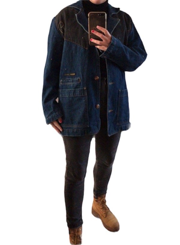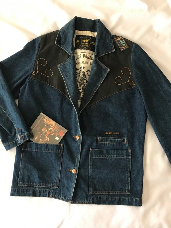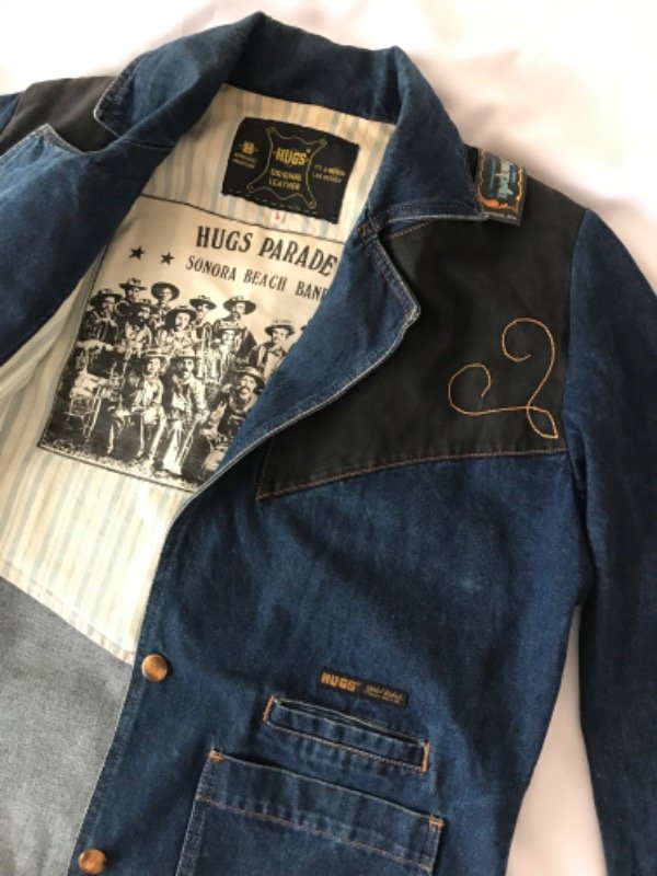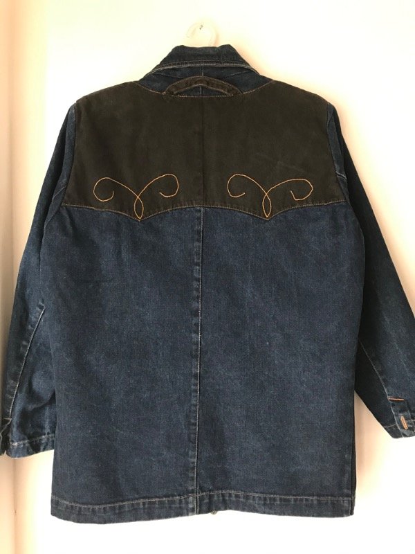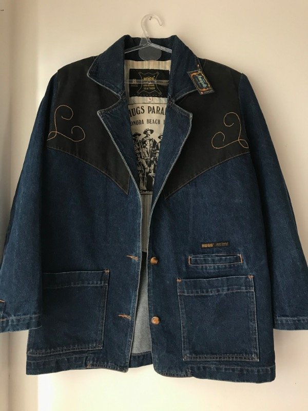 Chaqueta super vintage Hugs, de Jean rígido combinada con negro y un bordado muy texano, con bolsillo externo e interno mas una increíble estampa en su interior, es recta Talle L queda un lujo