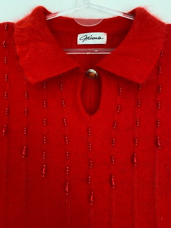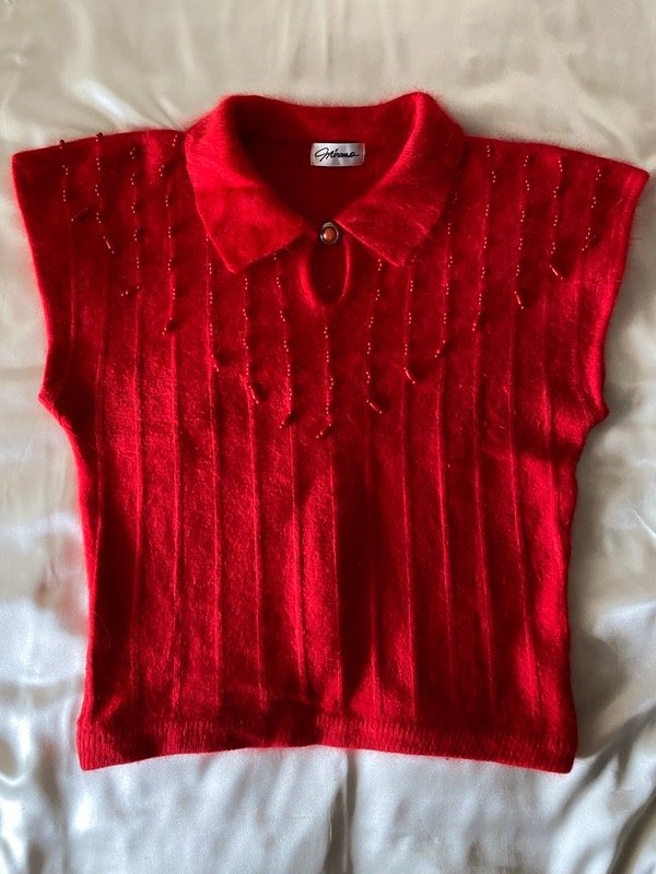 Remera tejida de bremer con cuellito y manga japonesa, bordada en el frente, lana super suave 80% angora