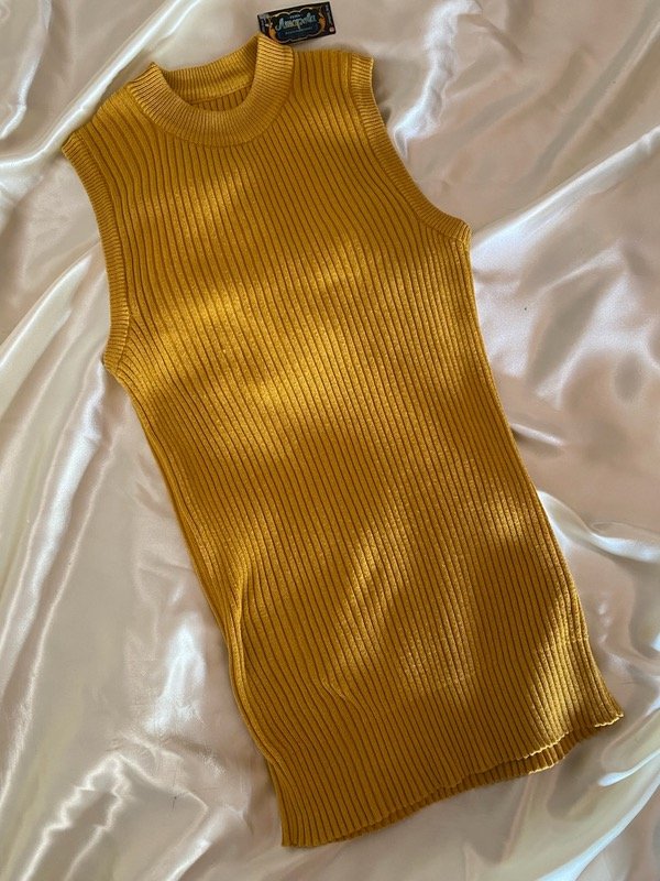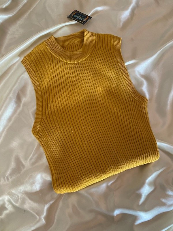 Musculosa morley de hilo color mostaza con cuello redondo alto,