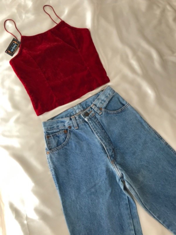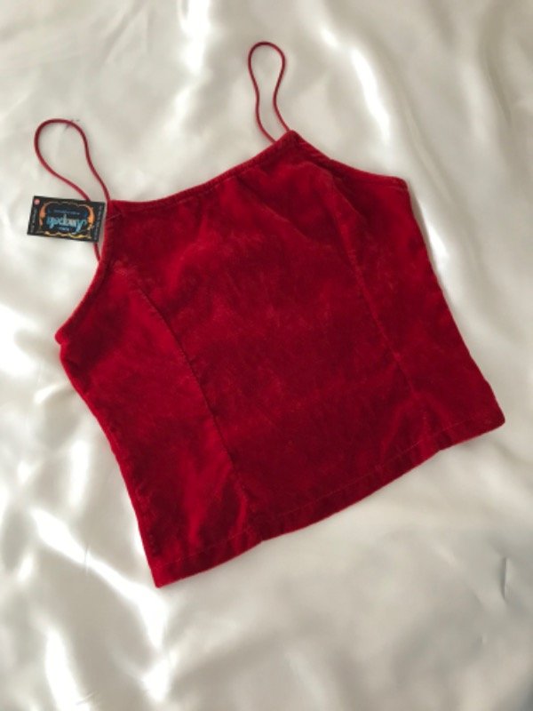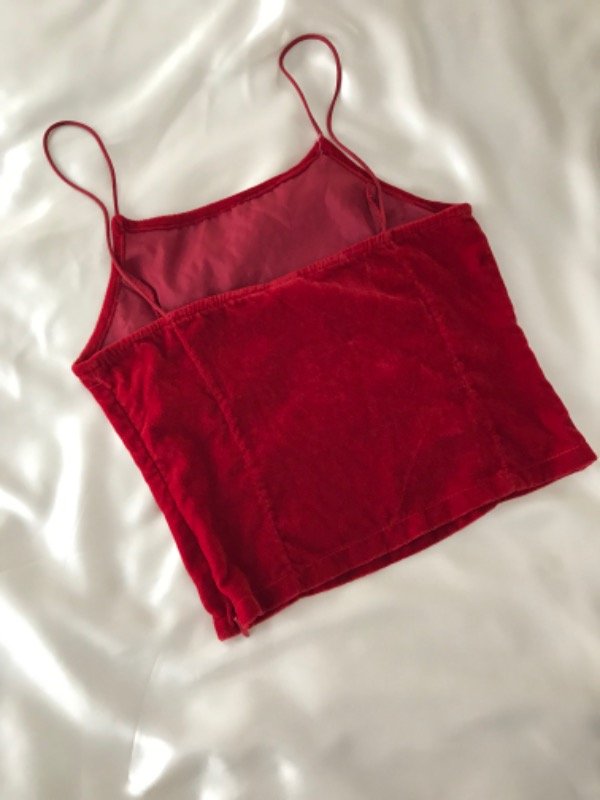 Top Velvet rojo, rígido con cierre de costado, talle pequeño