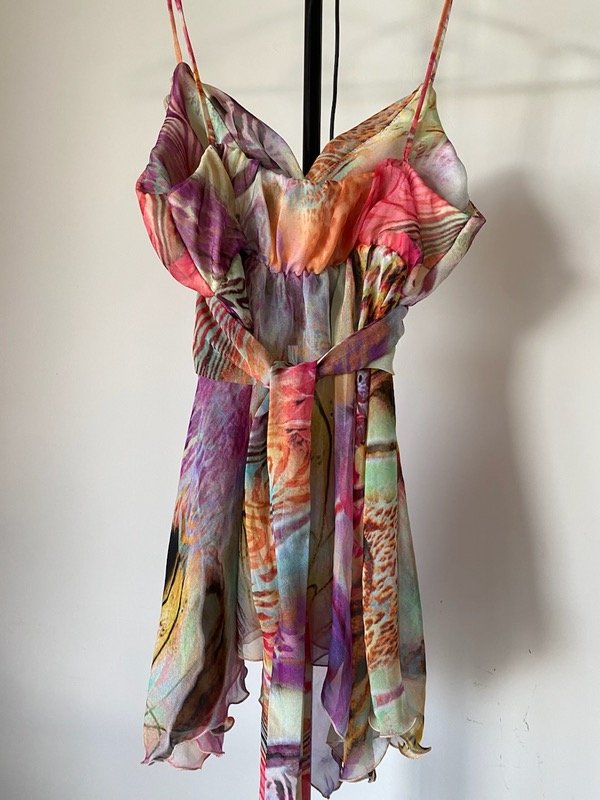Medidas: contorno abajo del corpiño que tiene elástico va de 65 a 86cm, largo 75cm los picos mas largos