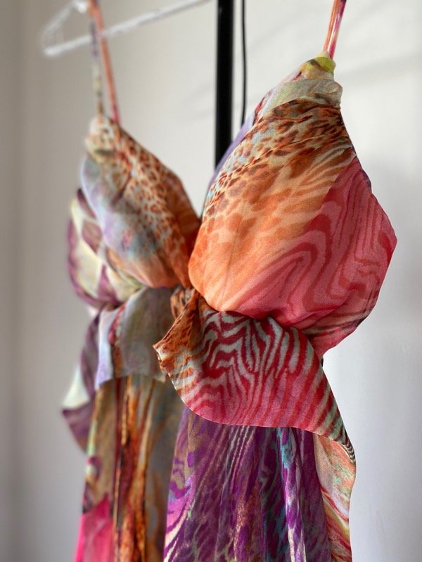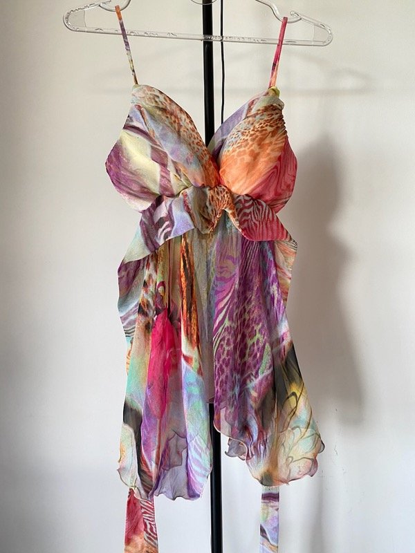 Top dosmilero de gasa estampada en picos, con corpiño armado y lazo para atar en espalda