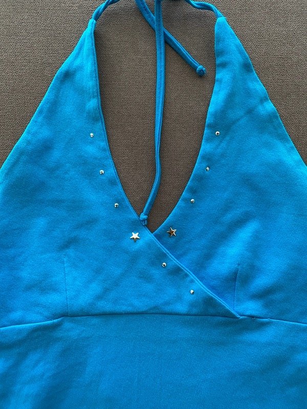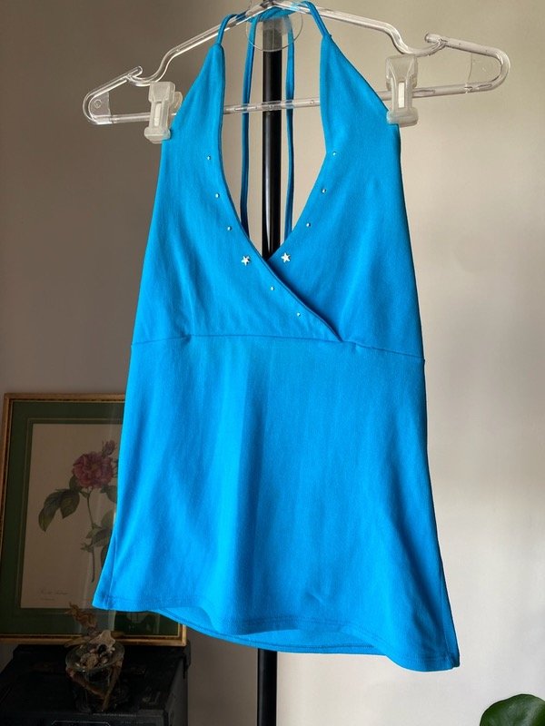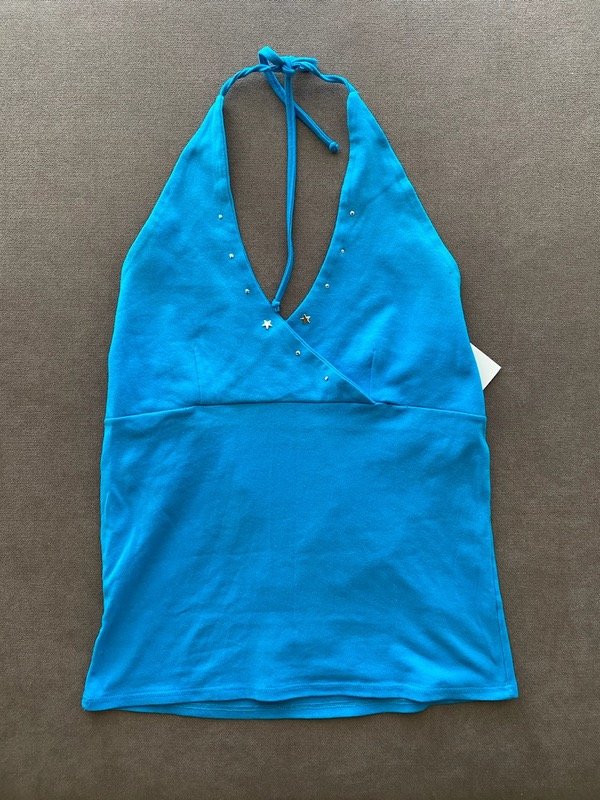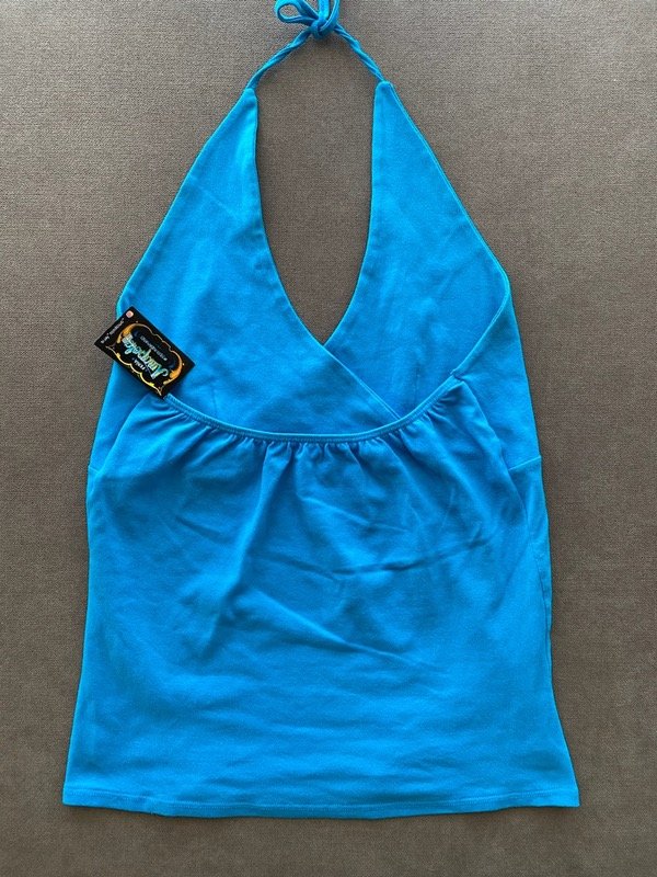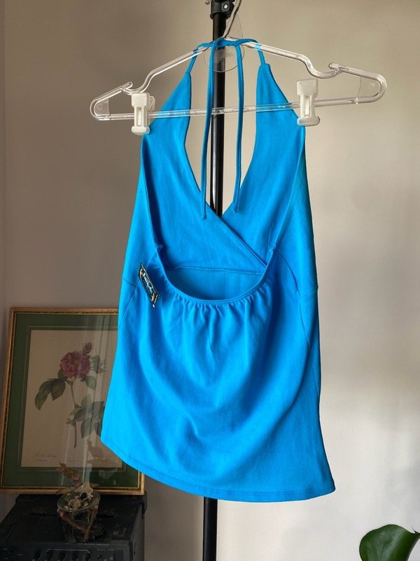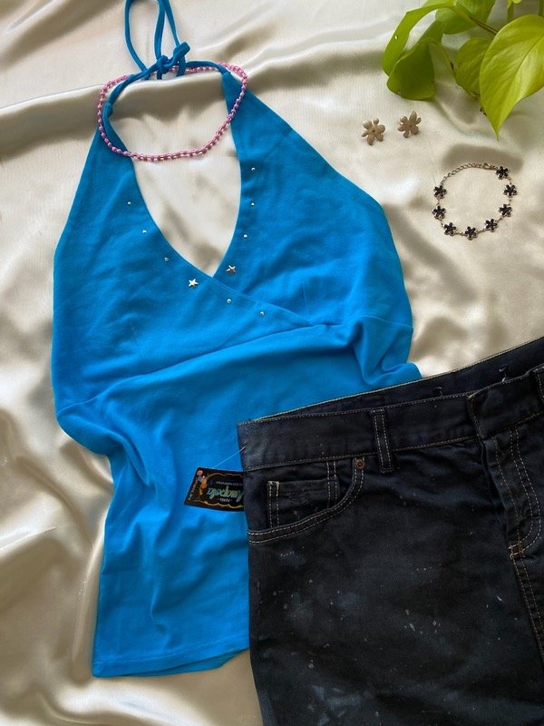 Top dosmilero sin uso, turquesa elastizado escote marilyn cruzado y atado al cuello