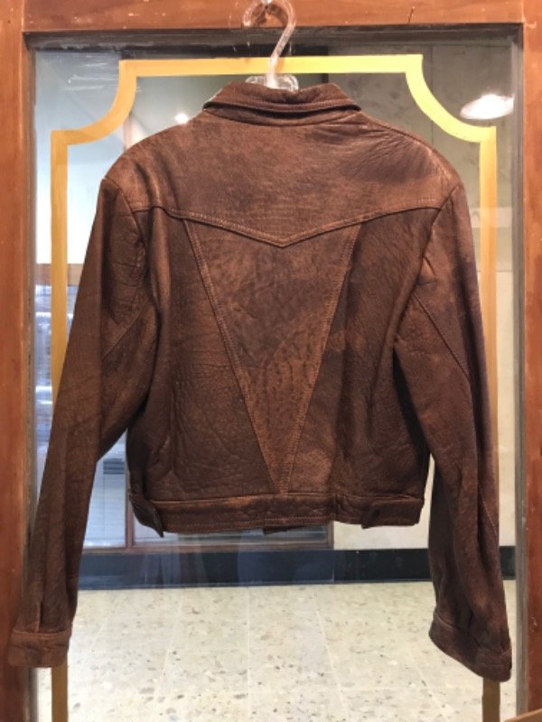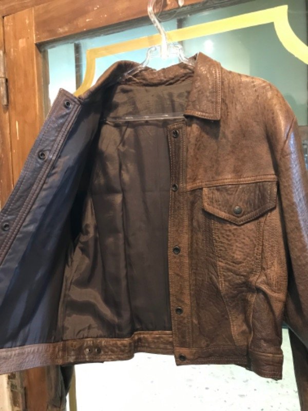 Chaqueta de cuero vintage, forrada, de cuero marrón con textura, corte estilo trucker corta, ancha de hombros