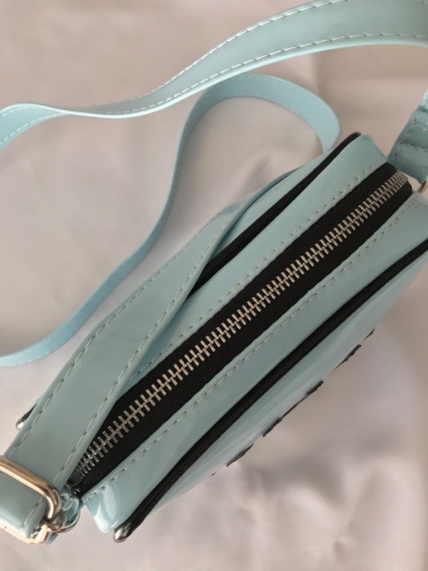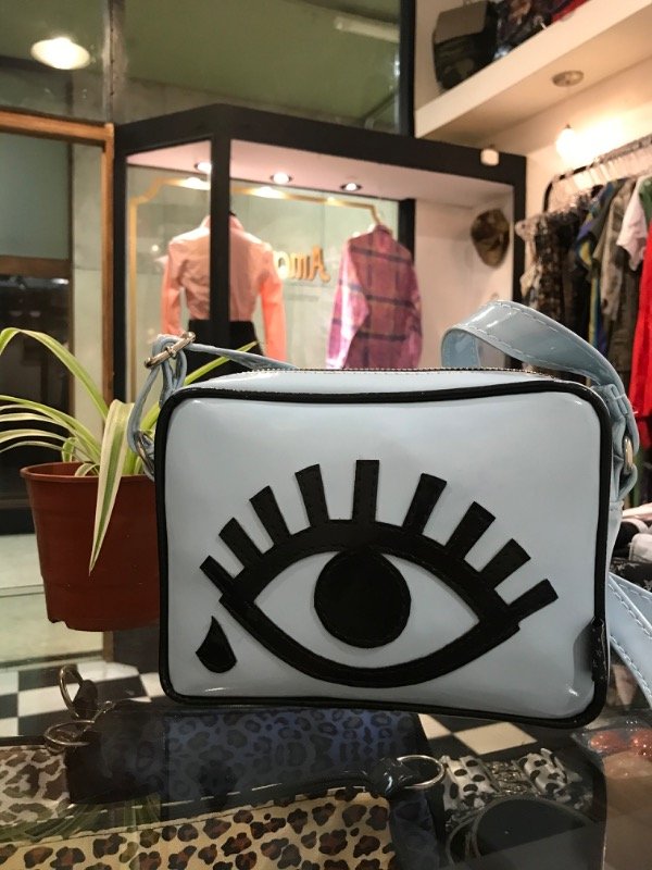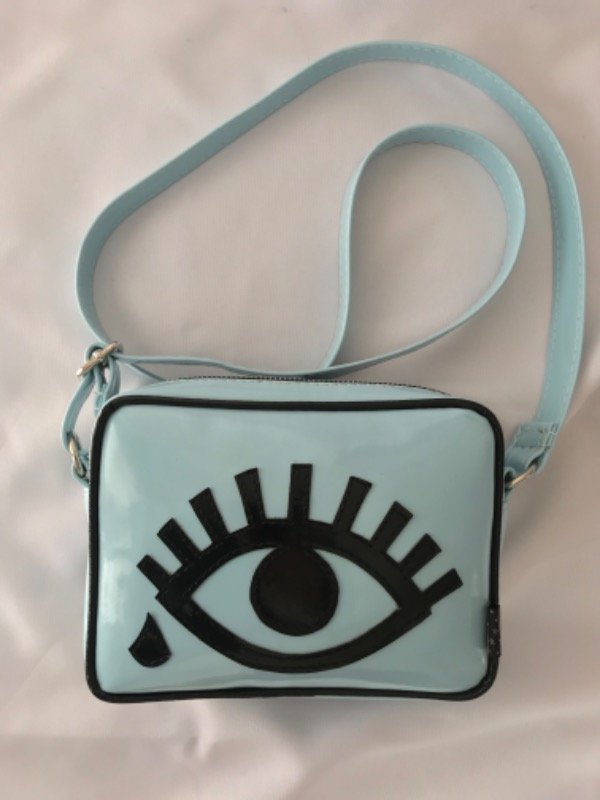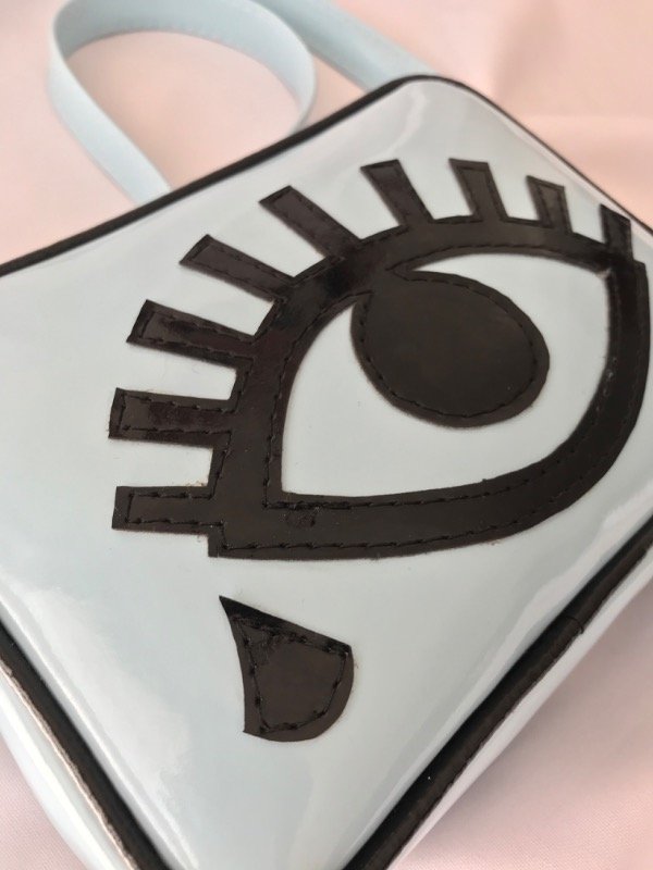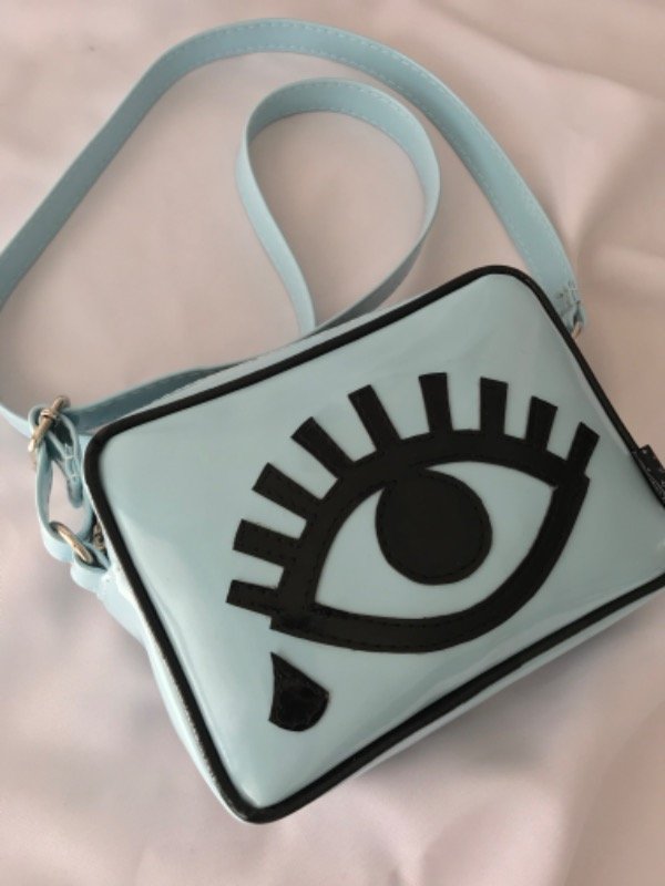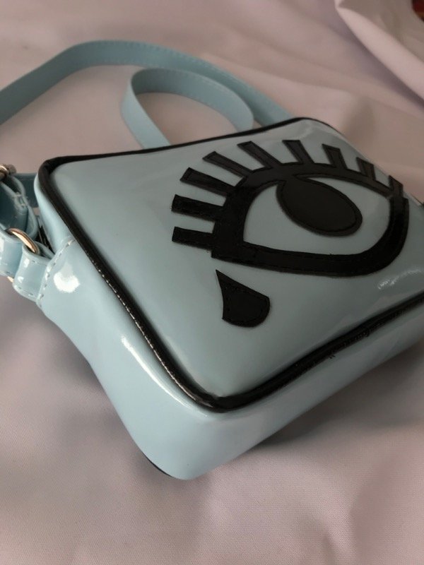 morral de charol celeste con aplique de ojo también en charol, forrada