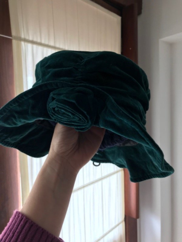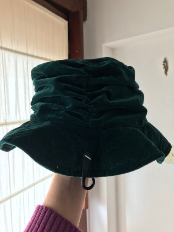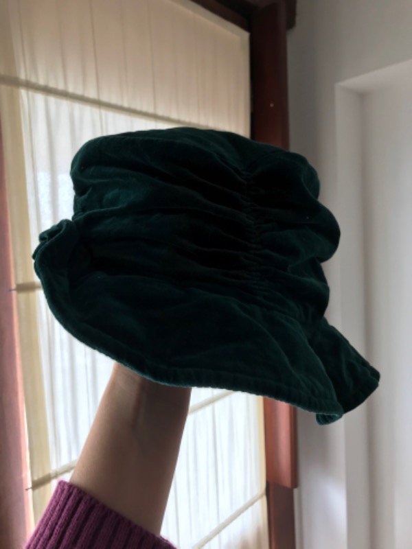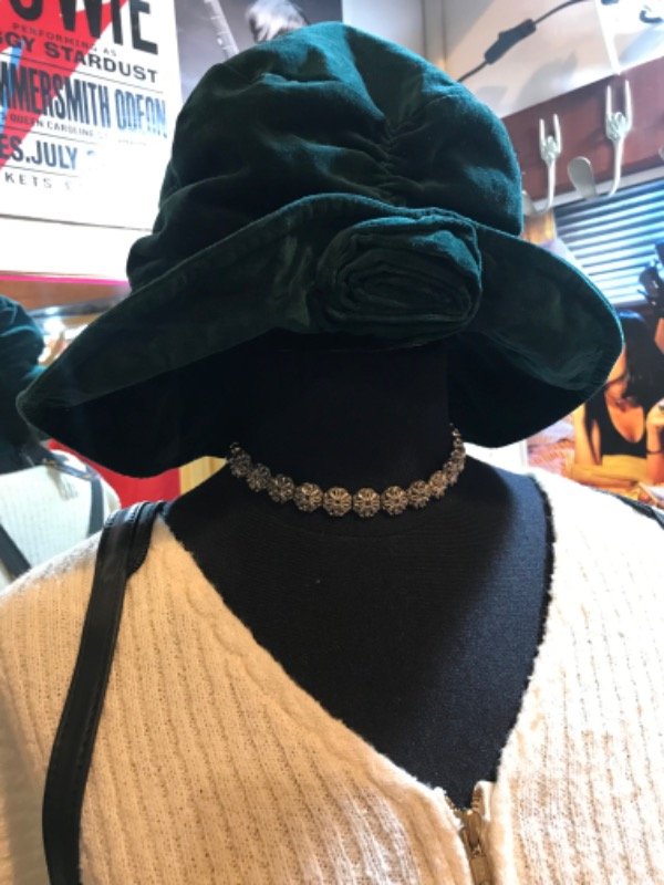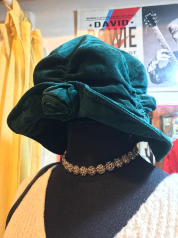 Sombrero verde vintage sin uso, de terciopelo forrado, con una rosa y frunces
