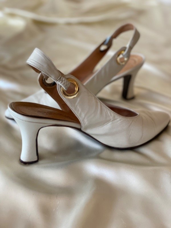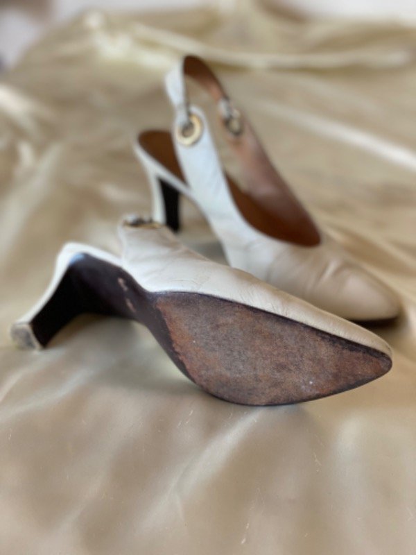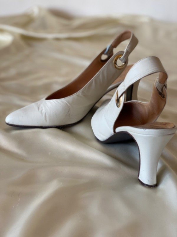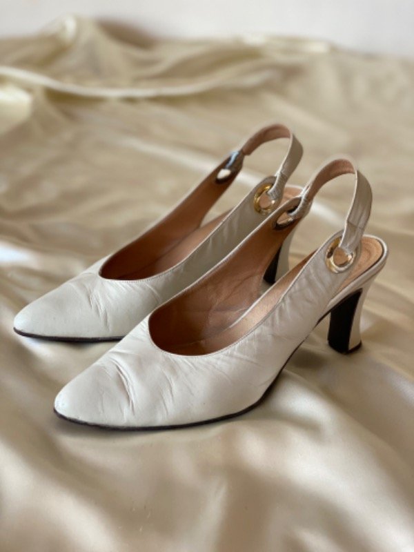 Zapato vintage tipo estileto con agarre en talón, de cuero color hueso y taco medio a bajo, cuero también por dentro N 38 25cm de plantilla sin la punta, taco 6cm de altura
