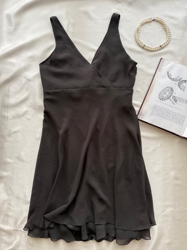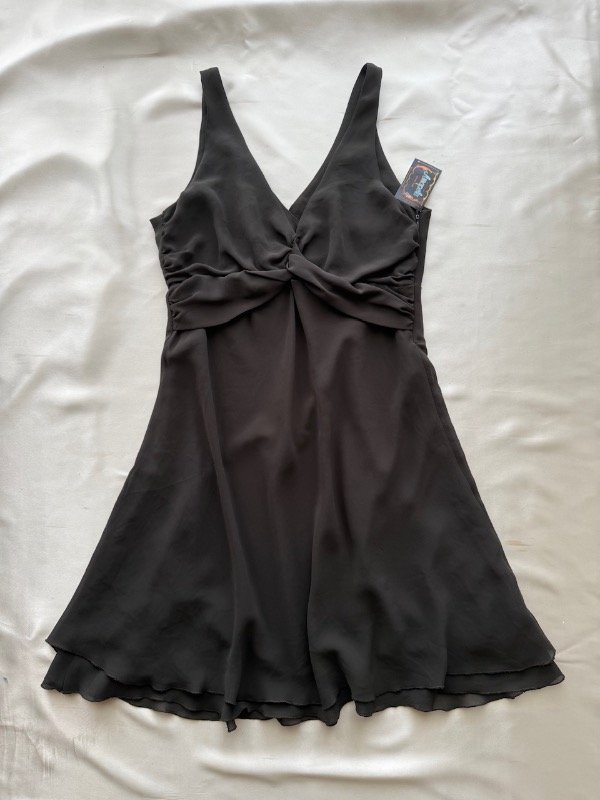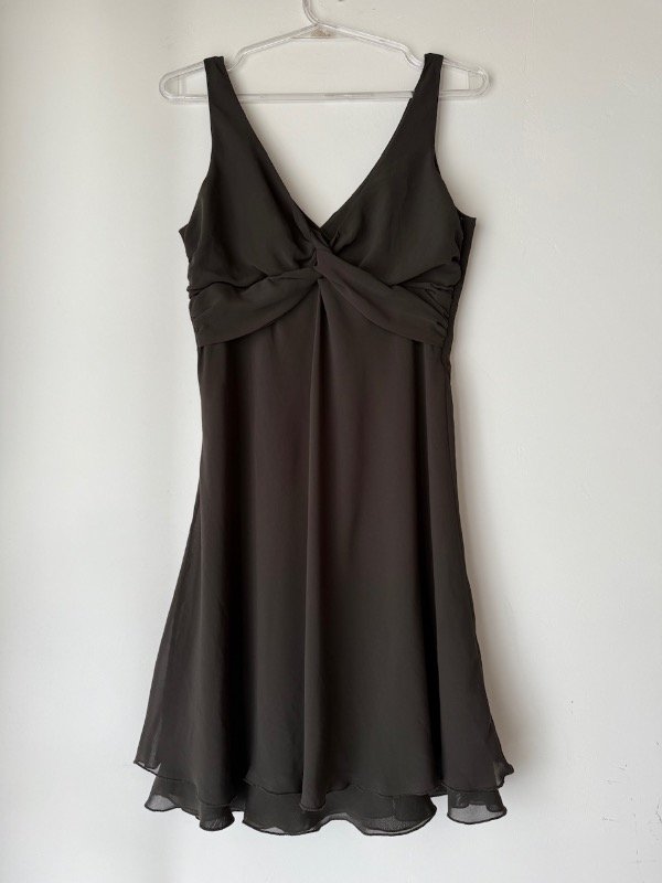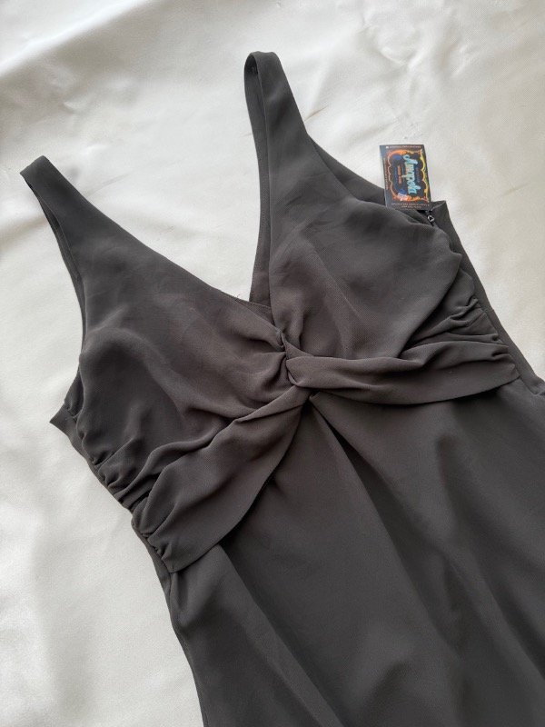 Vestido vintage tiene escote con nudo en el busto todo drapeado y 3 capas de gasa en la falda, cierre de costado, divino