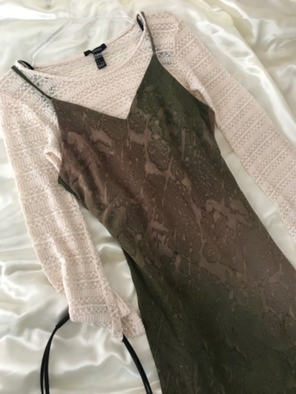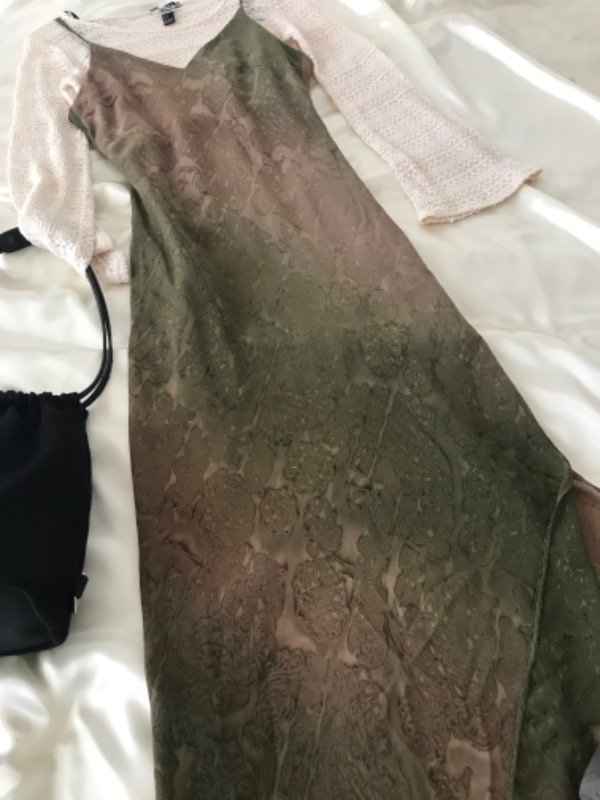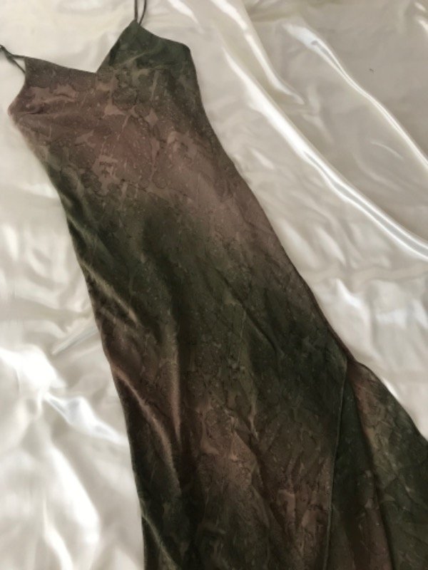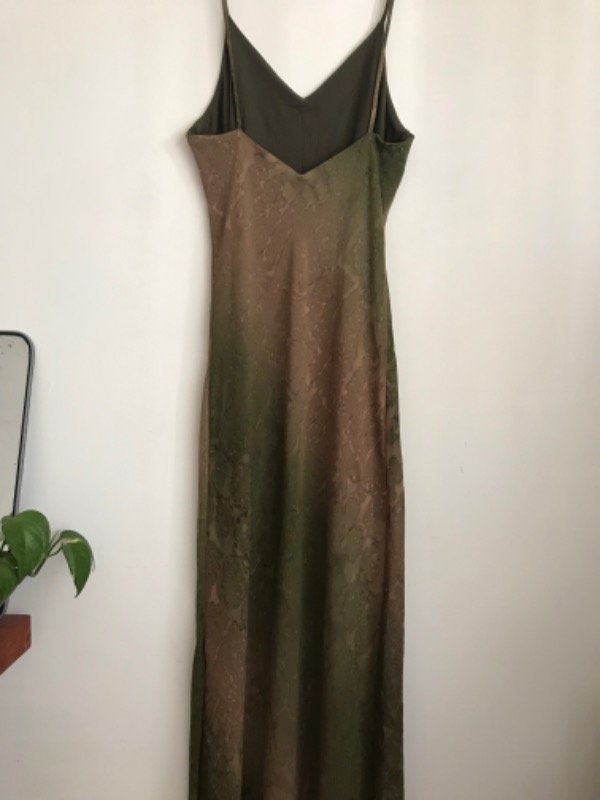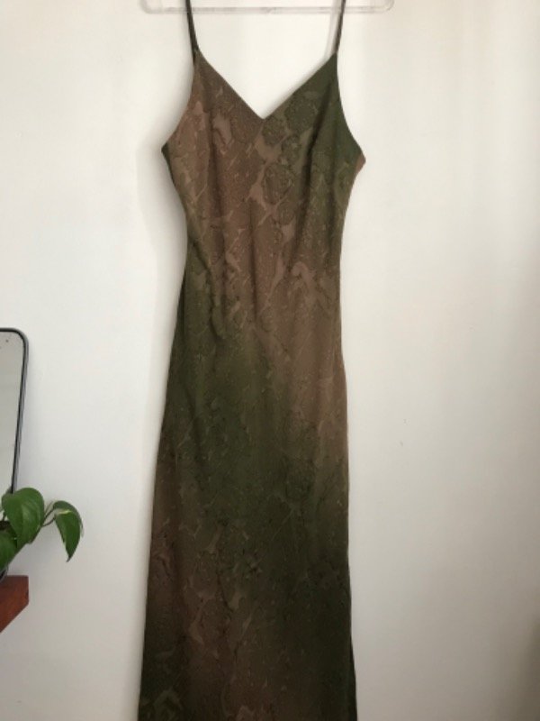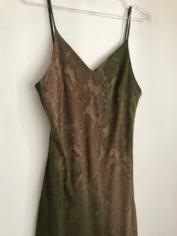 Vestido vintage dosmilero sin uso, de gasa forrado, largo con tajo lateral, queda al cuerpo , cede un poco