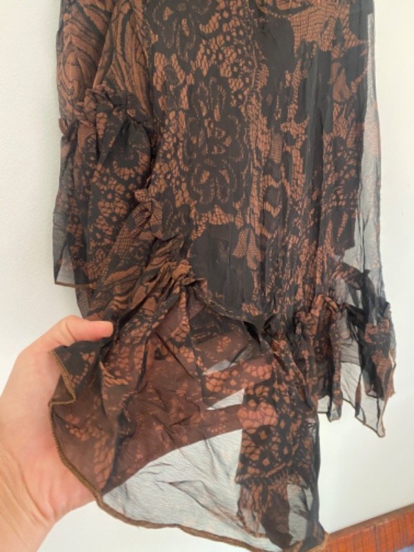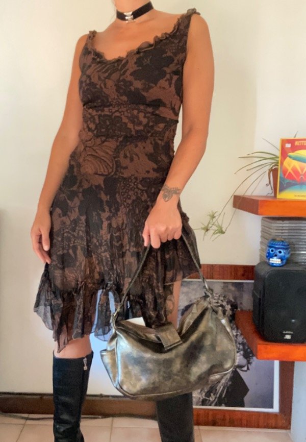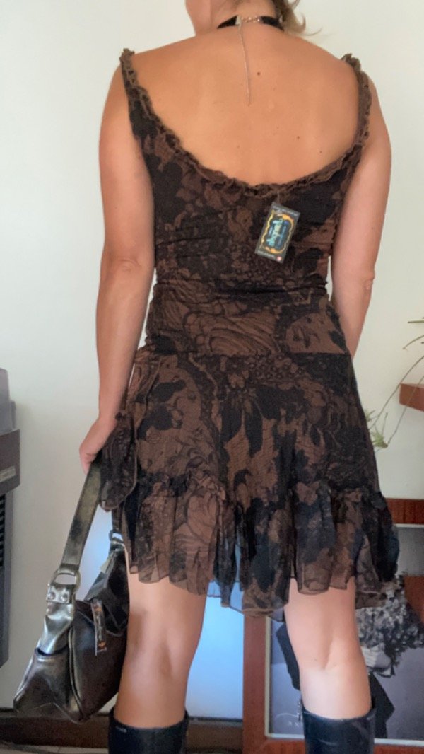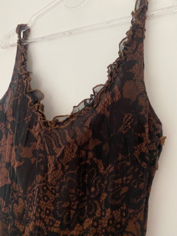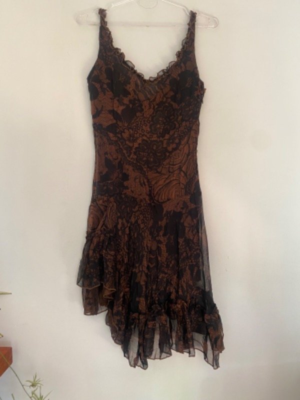 Vestido dosmilero de Ossira talle S, gasa estampada forrada , con volados pequeños en todo el borde superior, y un volado ancho e irregular en el borde inferior, color chocolate con estampa que simula un encaje negro, cierre de costado