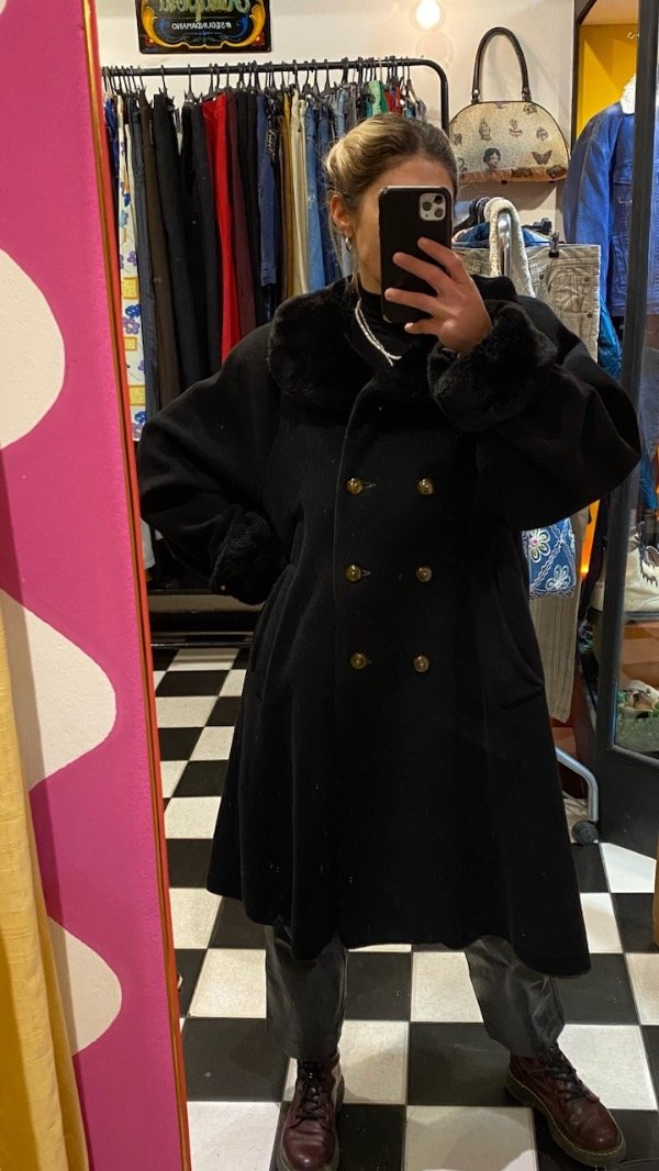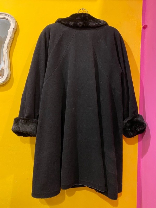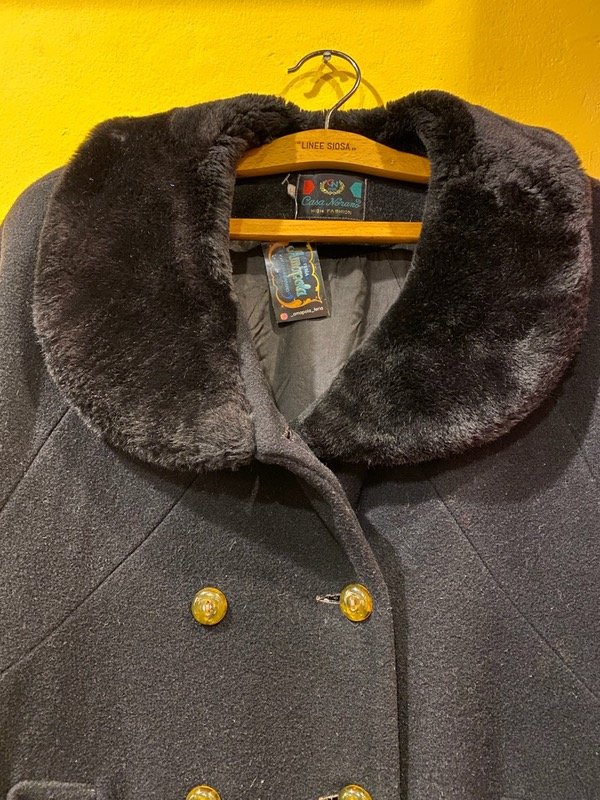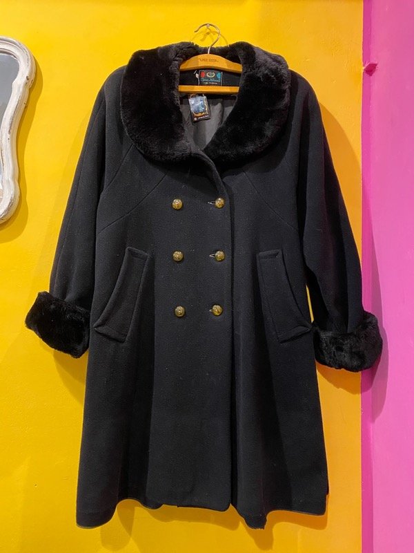 Tapado de paño vintage con cuello y puños de piel sintética, la calidad del paño es increíble (lana y cashmere) mega abrigado y no tan pesado, corte evasé, manga rangla q sale del hombro, forrado, con bolsillos interno y externos, cierre cruzado con bellos botones, talle 3 según etiqueta, queda lindo igualmente para usar Oversize