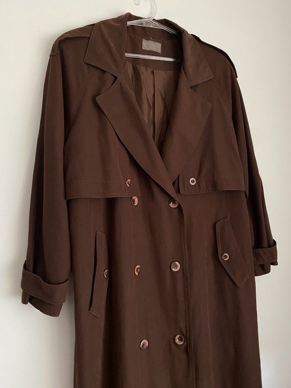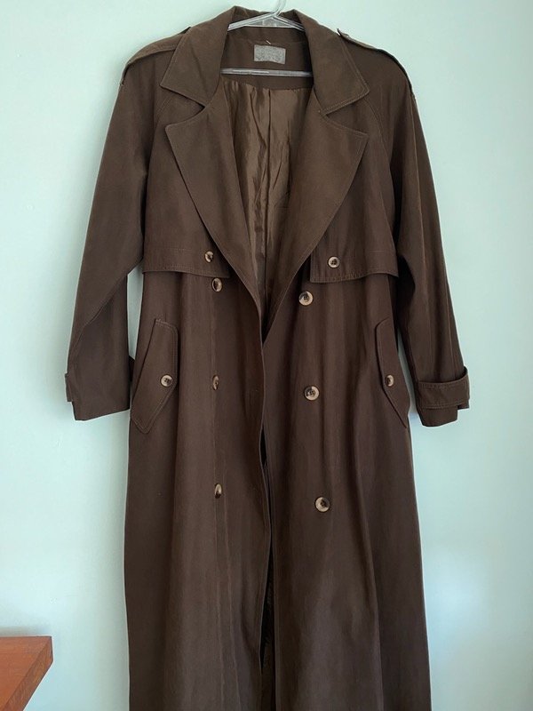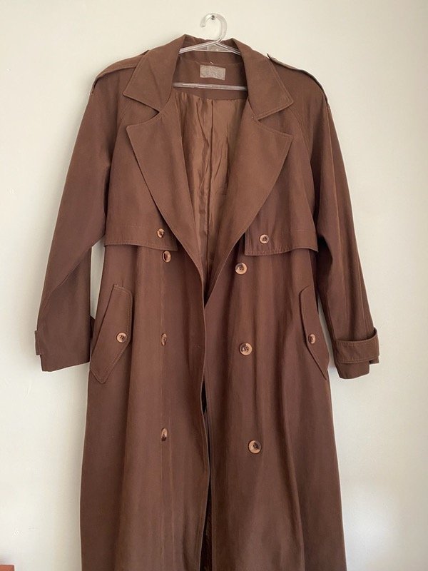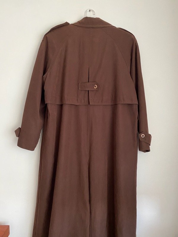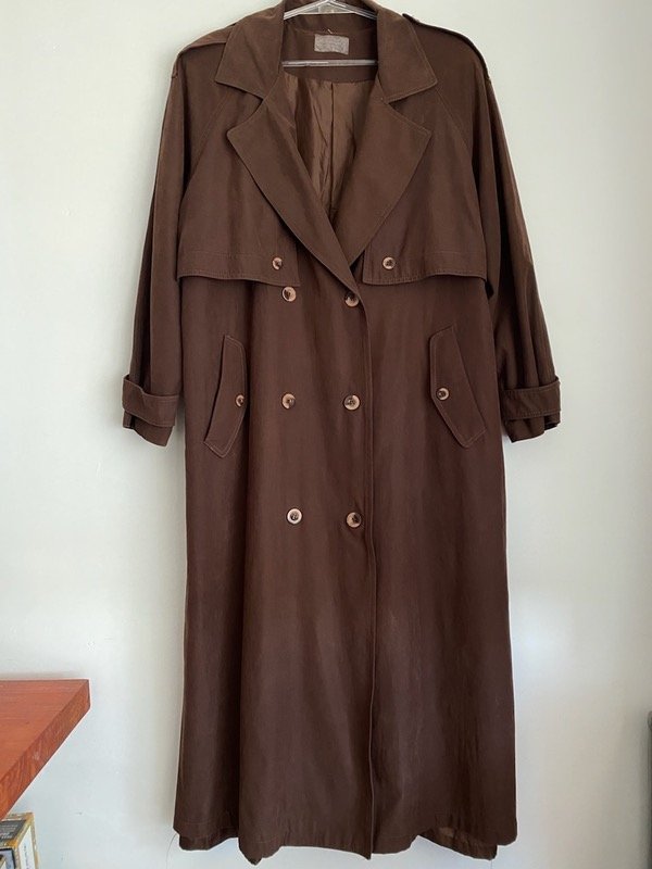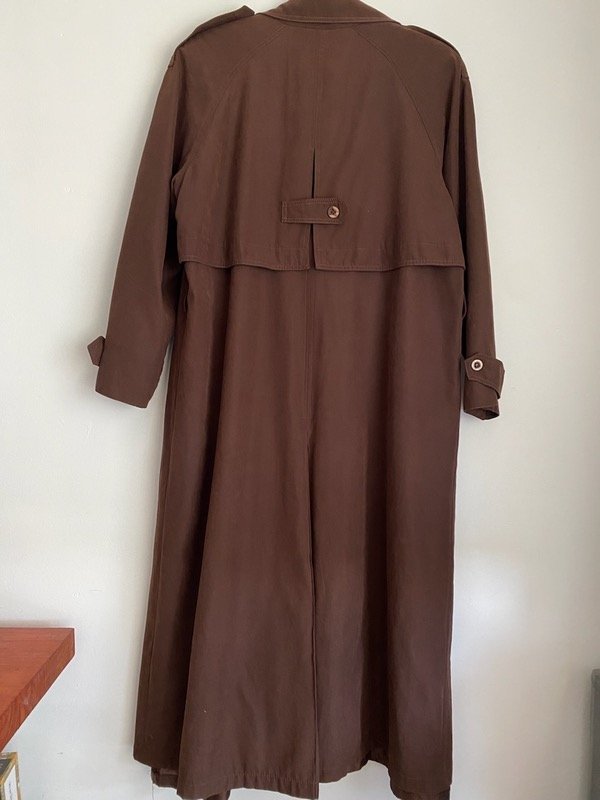 Trench vintage color chocolate gamuzado, manga ranglan, solapas y charreteras, bien largo Y liviano, con pasacintos, sin cinturón, calculo un Talle M