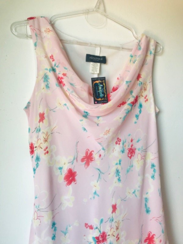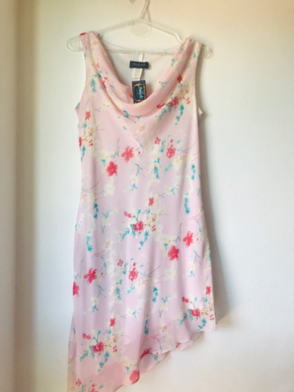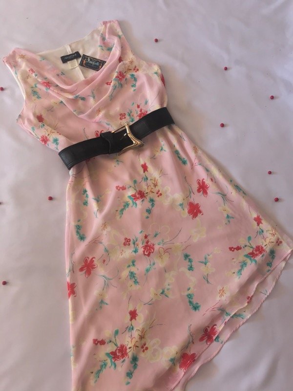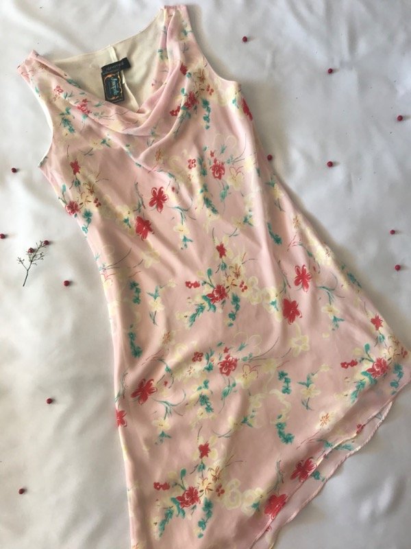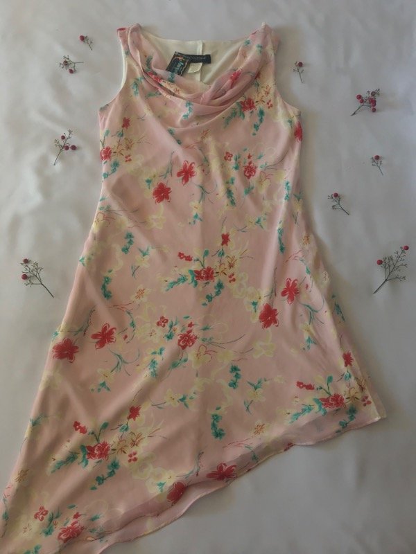 Vestido de gasa estampada forrado, cuello bote y borde inferior en pico, super lindo