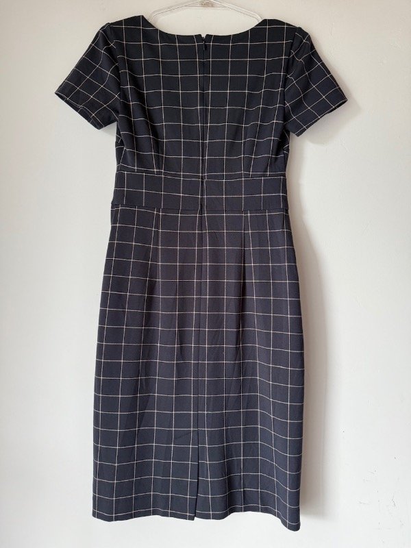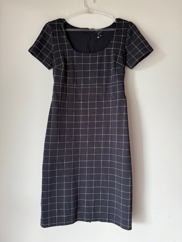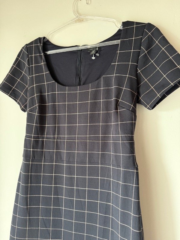 Vestido Ann Taylor Second hand azul a cuadros, elastizado con cierre en espalda, forrado, largo midi, escote redondeado y recorte abajo del busto