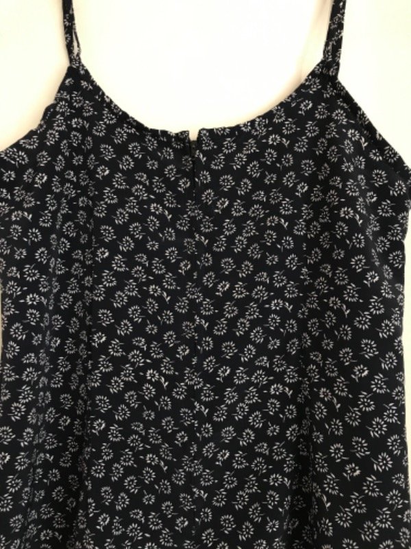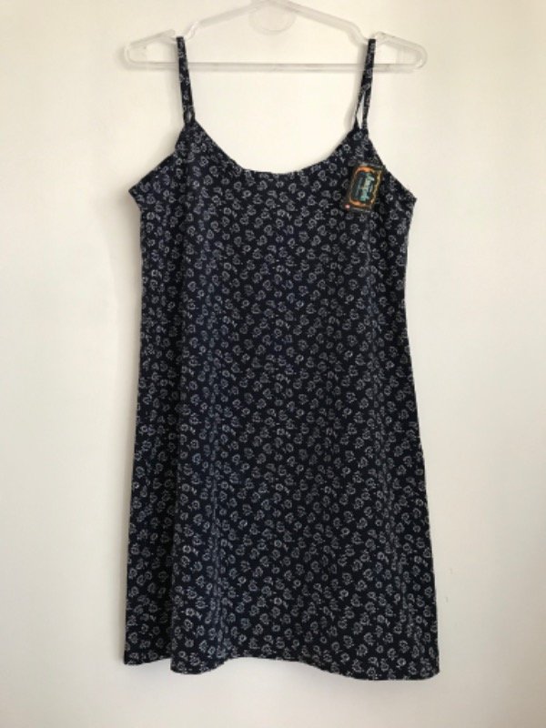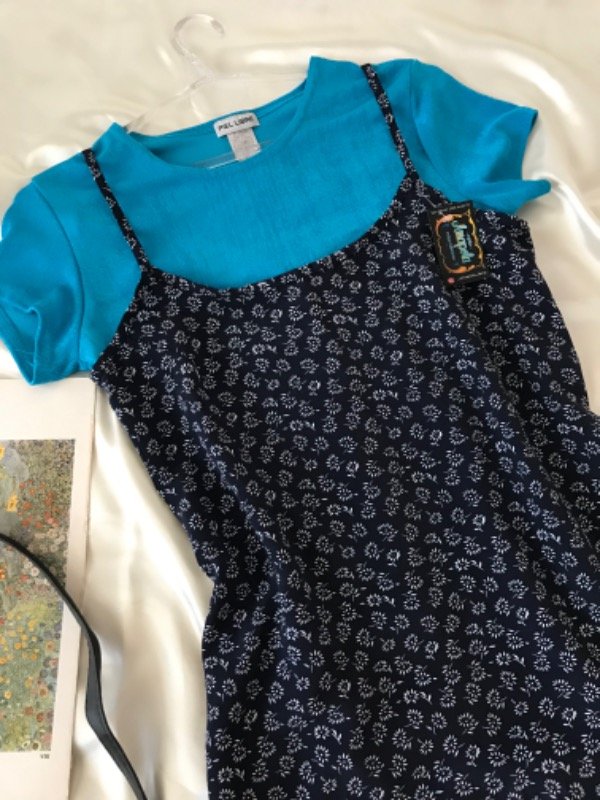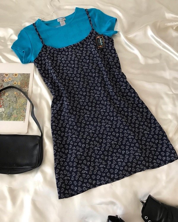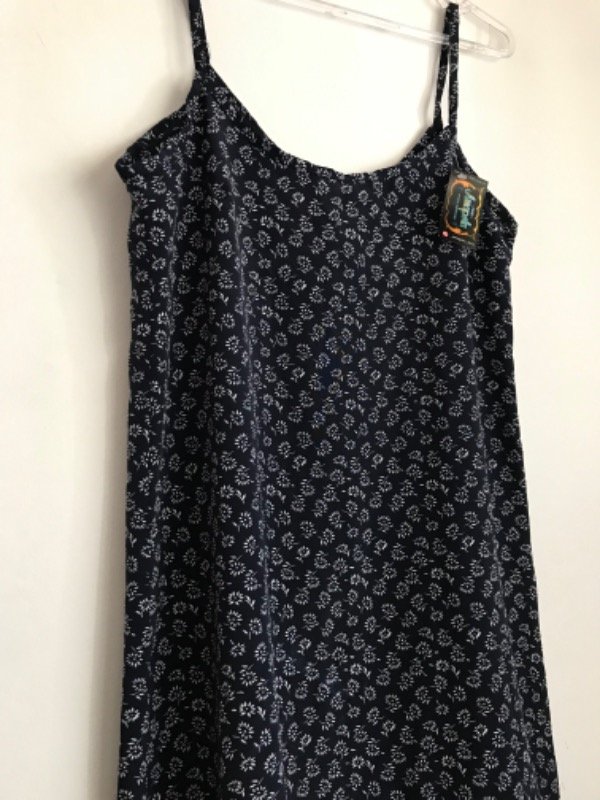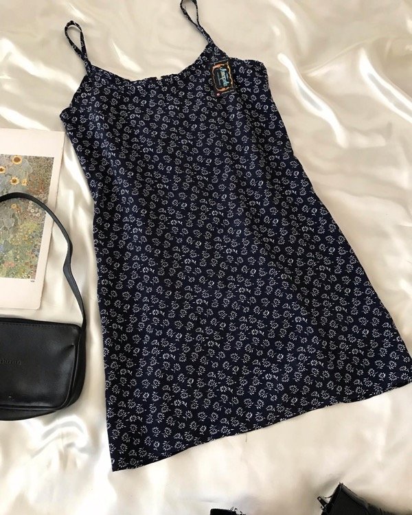 Vestido vintage de tiritas azul con margaritas blancas, cierre en espalda