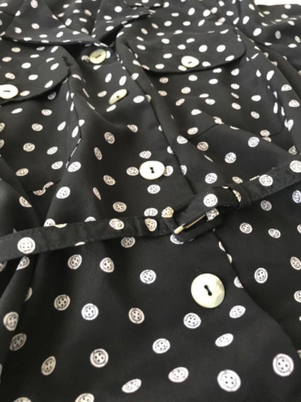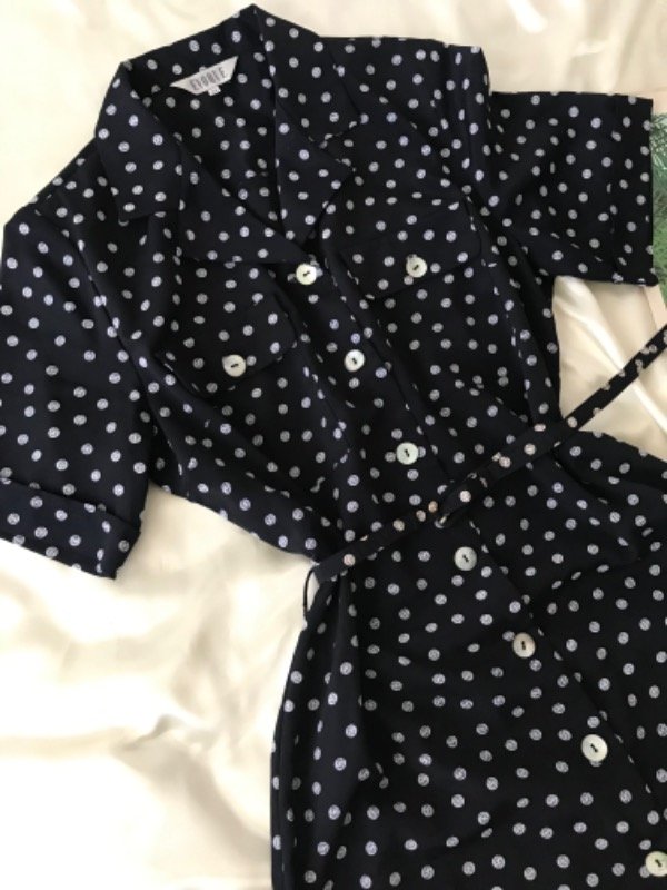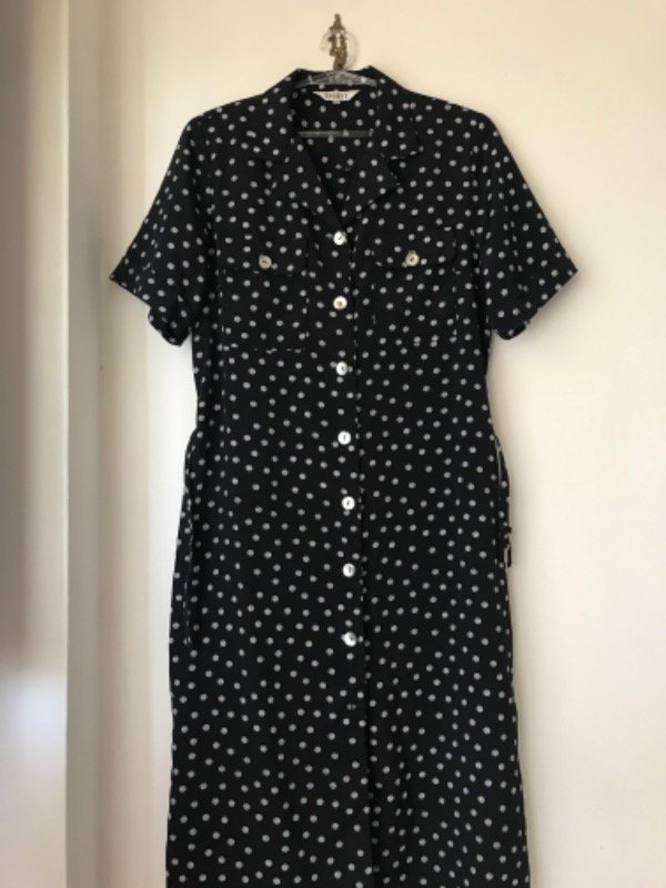 Vestido camisero vintage Evoque, bien largo, es un azul muy oscuro casi negro con print de botones, con cinturón