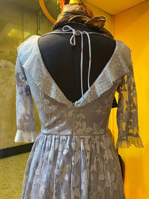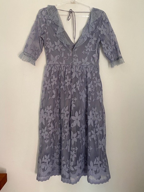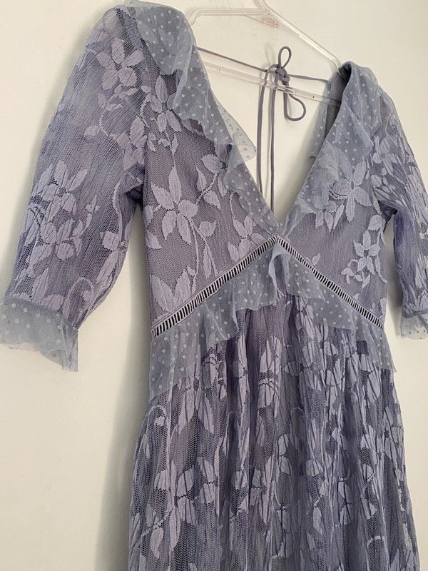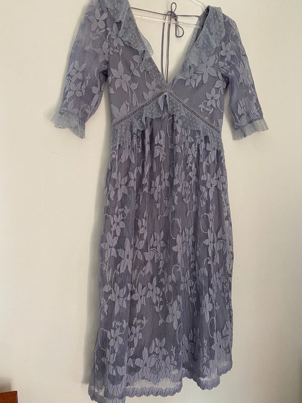 Vestido nuevo con etiqueta de encaje gris forrado, escote en v tambien en espalda y volados en tul con puntitos, talle Eur 36