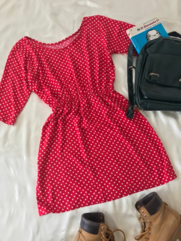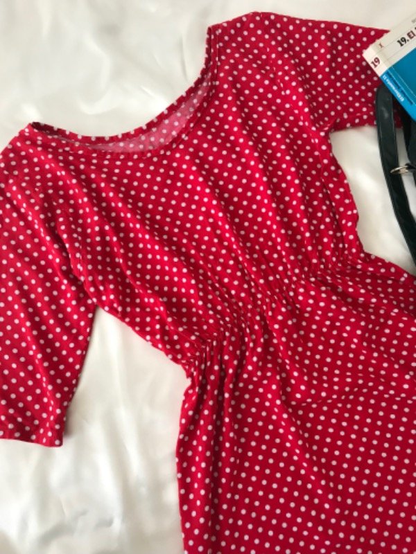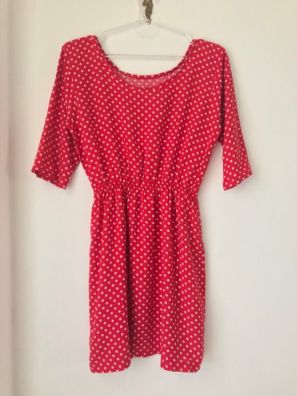 Vestido tipo fibrana rojo a lunares, con elástico a la cintura, manguita 3/4
