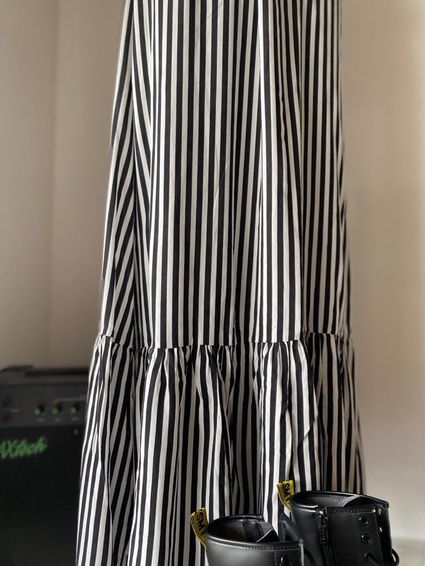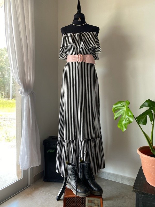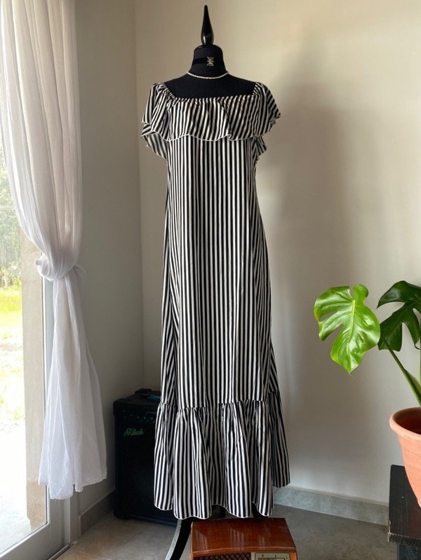 Vestido liviano bien largo, con escote para usar arriba o abajo de los hombros, tiene elástico en el escote, corte recto y final con volados