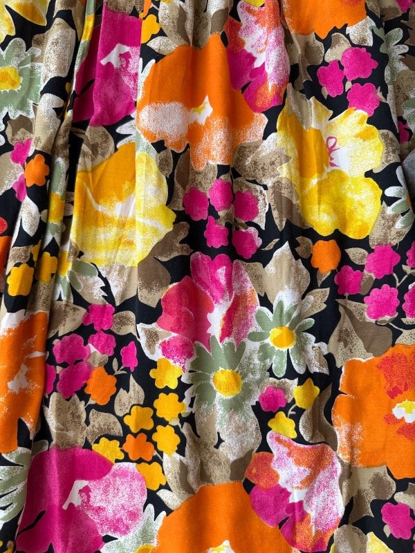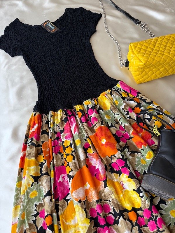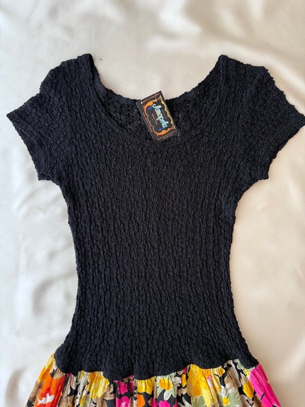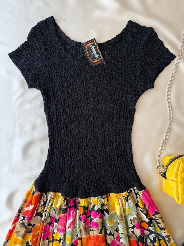Vestido vintage combinado con parte superior de un estilo de símil encaje de algodón elastizado q no transparenta casi nada, con escote redondo amplio y manguita corta, con una falda floreada q comienza en la cintura baja casi cadera