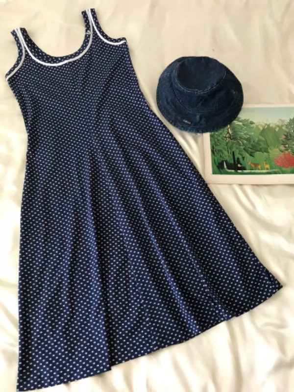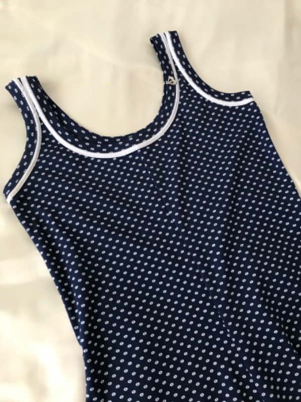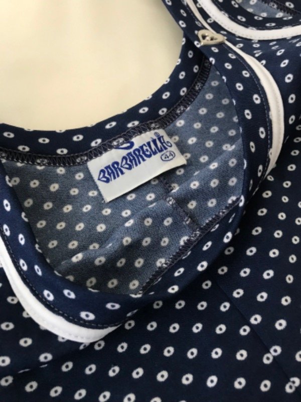 Vestido vintage Barbarella talle 44, es algo elastizado , azul marino con lunares pequeños