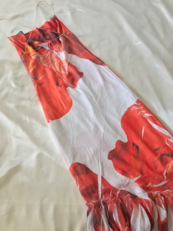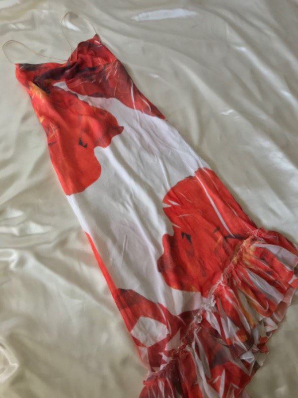 Medidas: ancho de pecho 40cm, ancho en cintura 36cm, largo 106 a 136cm en la parte mas larga