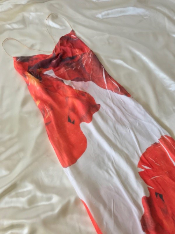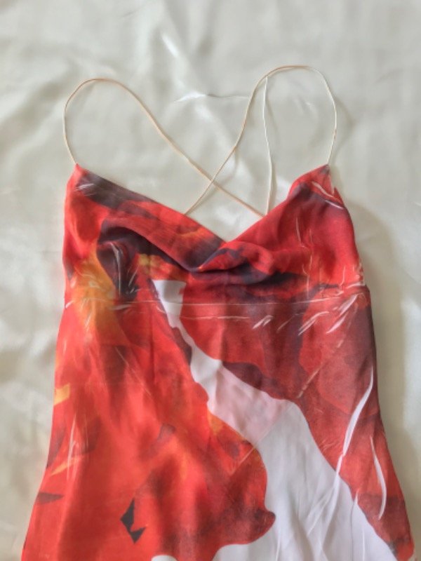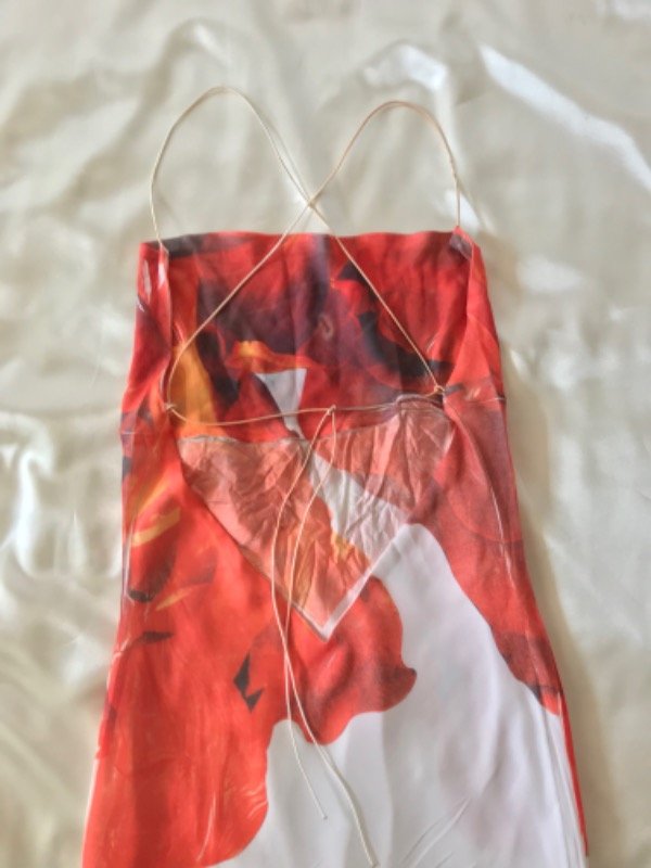 Vestido dismilero, en pico irregular, de gasa forrado, escote bote con tiritas que cruzan en la espalda descubierta