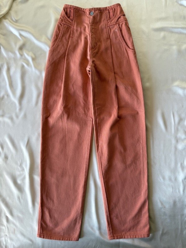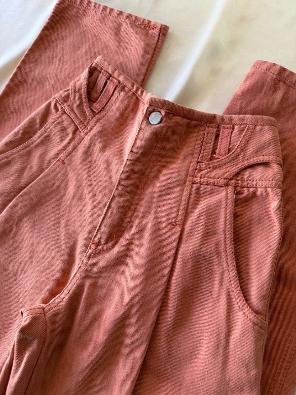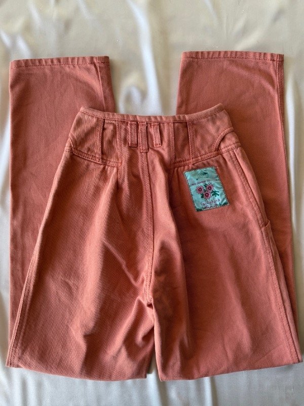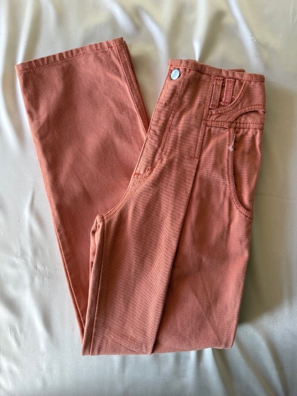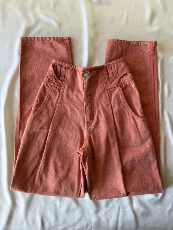 llamado Baggy en la época por sus marcadas pinzas q nacen de de la cintura dan volumen en cadera y muslos , este es color naranja tipo ladrillo claro, tiene detalles divinos en la cintura como los pasacintos, muy original y un calce hermoso, talle 38 según etiqueta 🏷️ (es más un 26 actual, guíate por las medidas SIEMPRE)