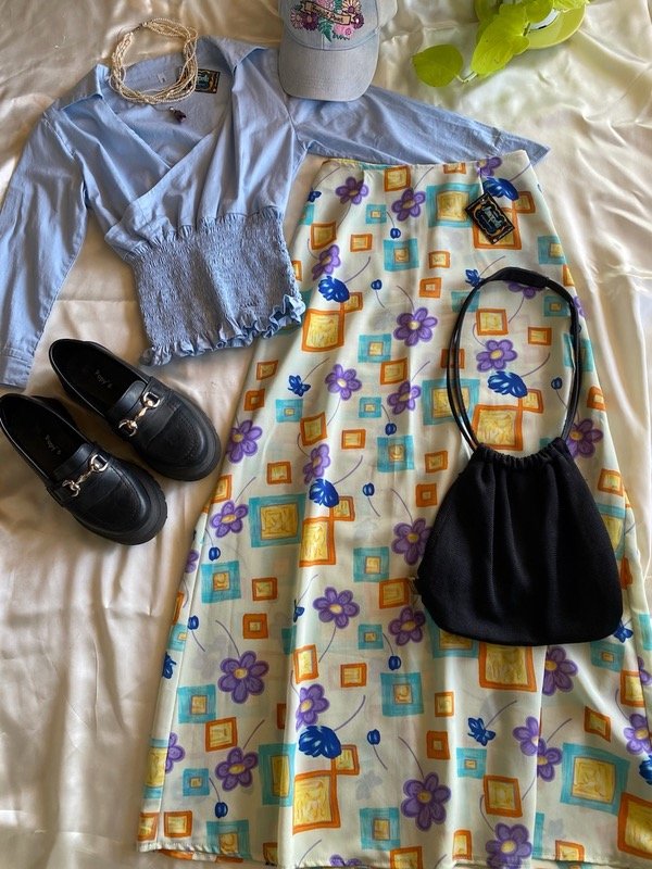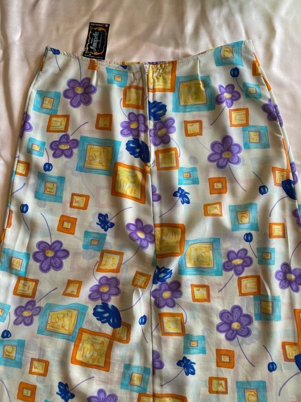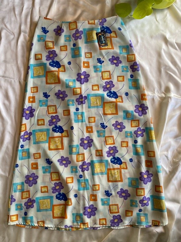 Flada larga con cierre atrás , la tela es como un crep estampado, no cede , no esta forrada