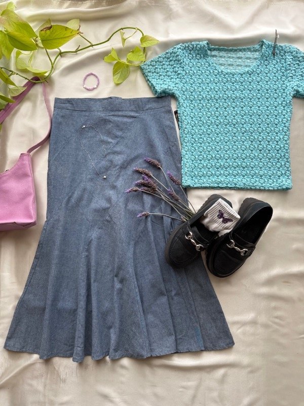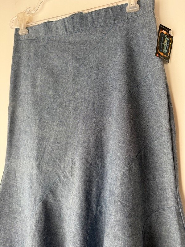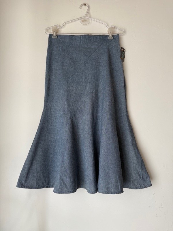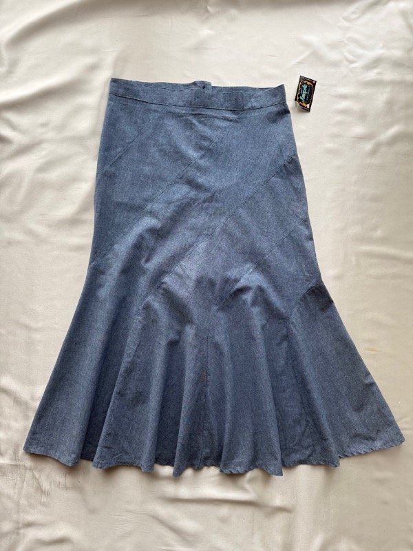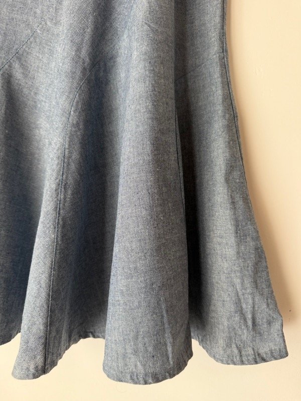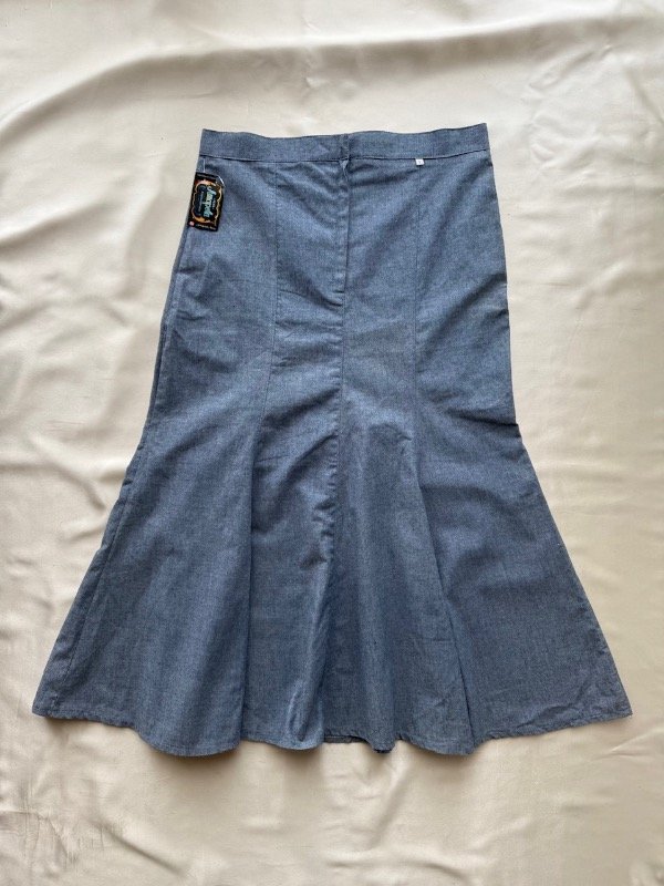 Falda simil denim liviano largo midi confeccionada en gajos diagonales que terminan en una hermosa caída tipo volados, cierre en espalda