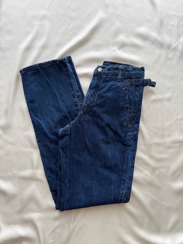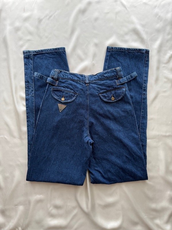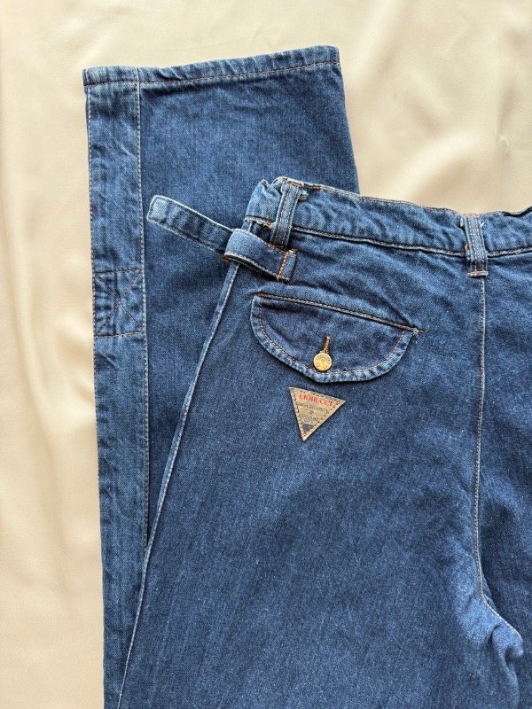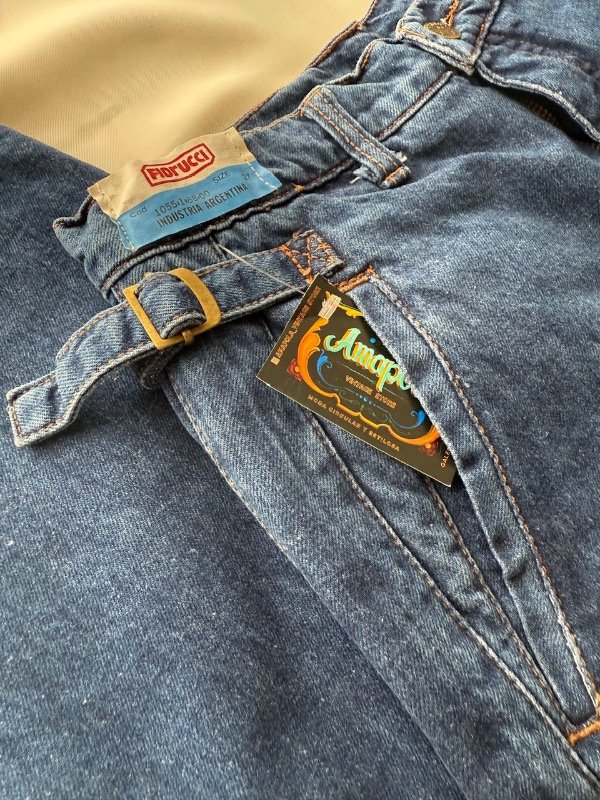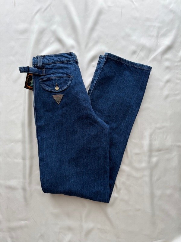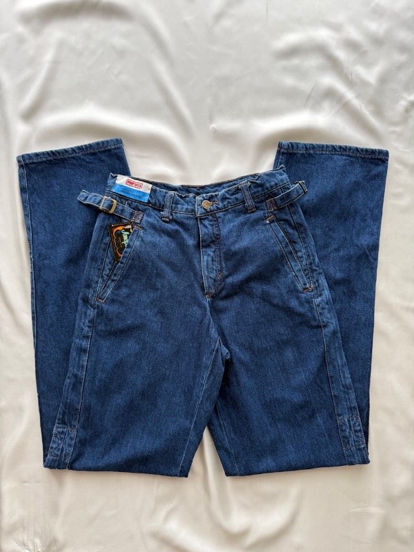 Jean vintage FIORUCCI sin uso este modelo es rígido pero un denim más blando q otros modelos de la época y la marca para usar más cómodo , tiene bolsillos chinos adelante, atrás bolsillo interno con solapas, hebillas en la cintura y una franja vertical en los laterales de las piernas