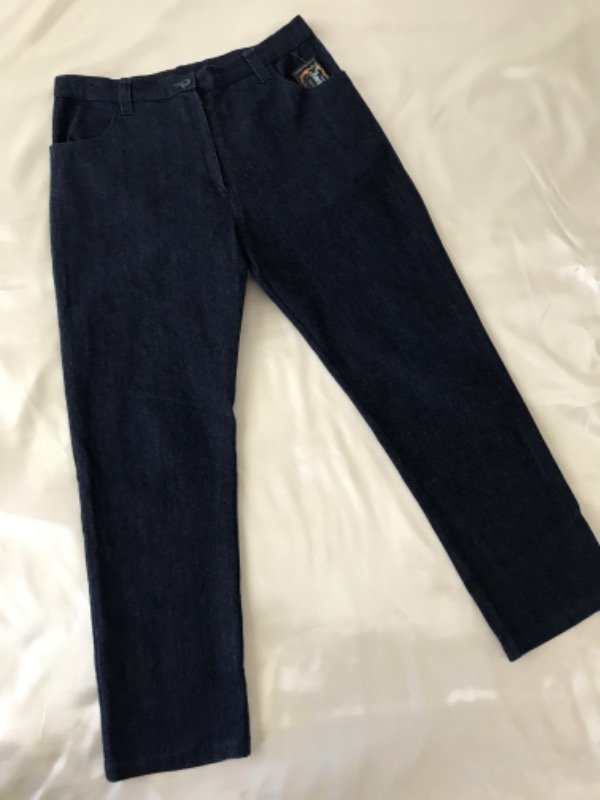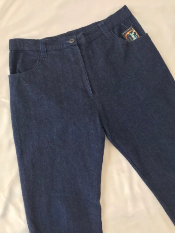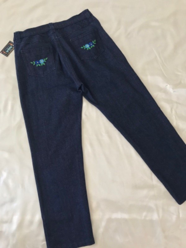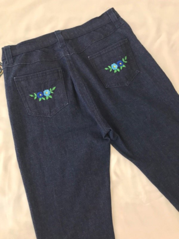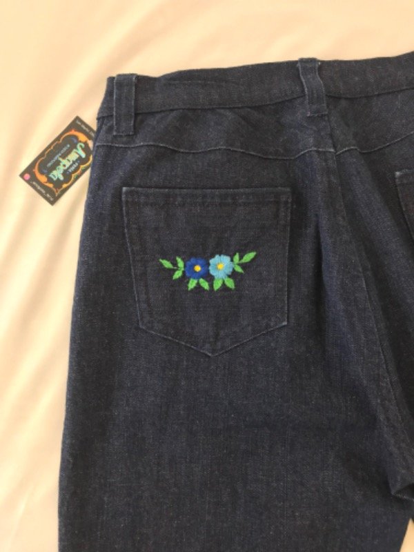 Jean azul tiro alto Semi elastizado con bolsillos, flores bordadas en los bolsillos de atrás, talle aproximado 32