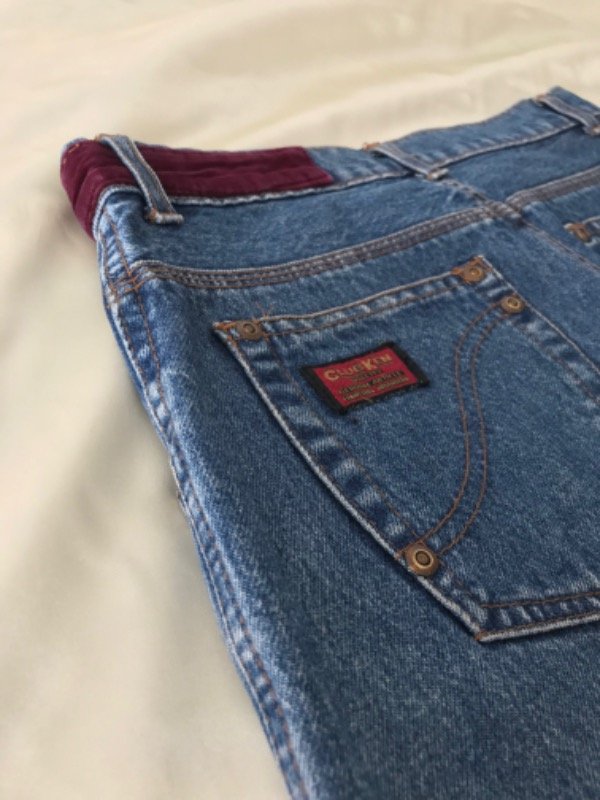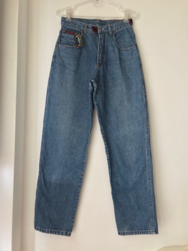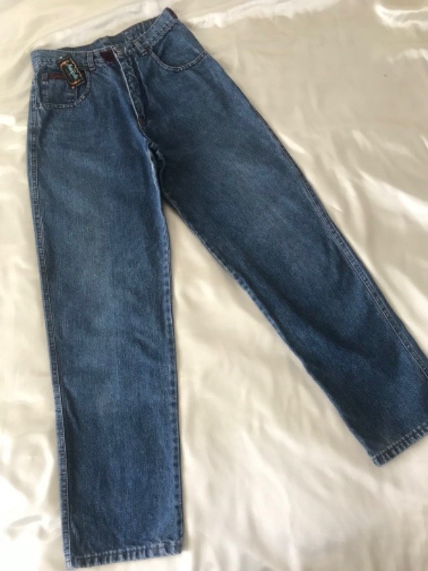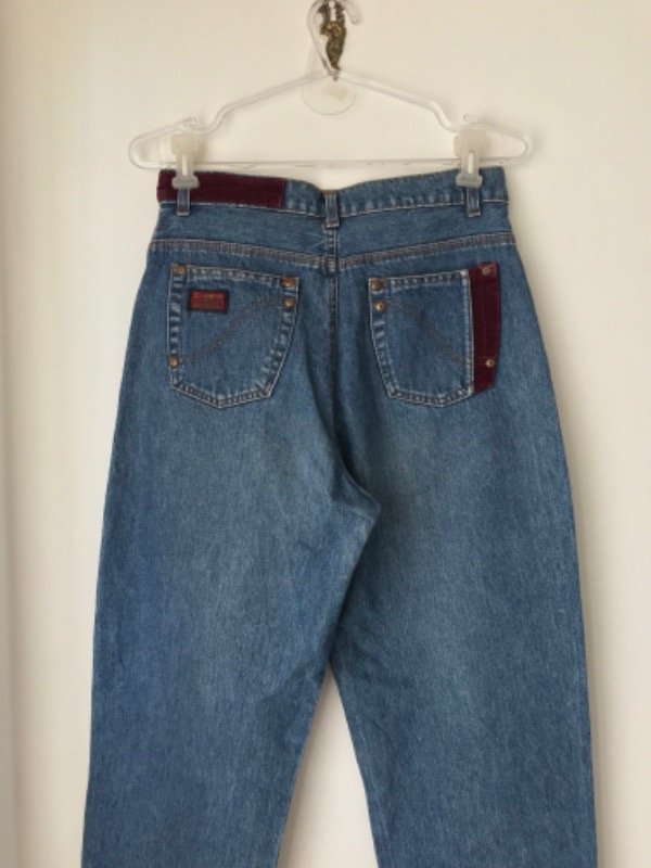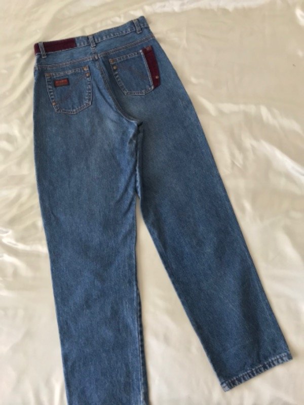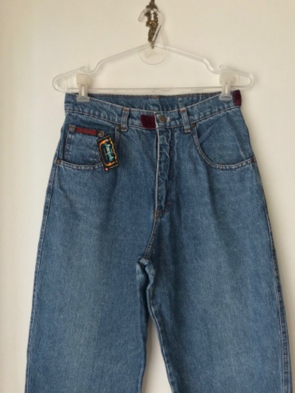 Jean vintage Club Ken talle 42, modelo super alto de tiro y ancho de piernas, tiene unos hermosos detalles en terciopelo en la cintura y bolsillo trasero. Es super especial