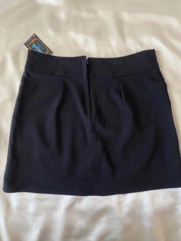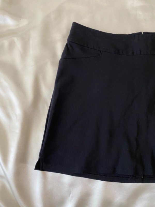 Mini falda dosmilera negra elastizada con cierre atrás, tiro medio, con falsos bolsillos
