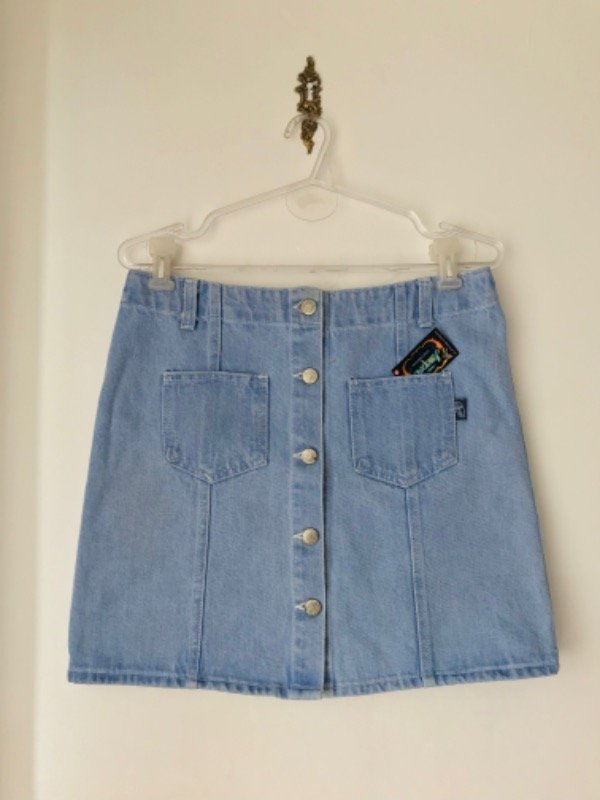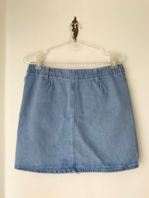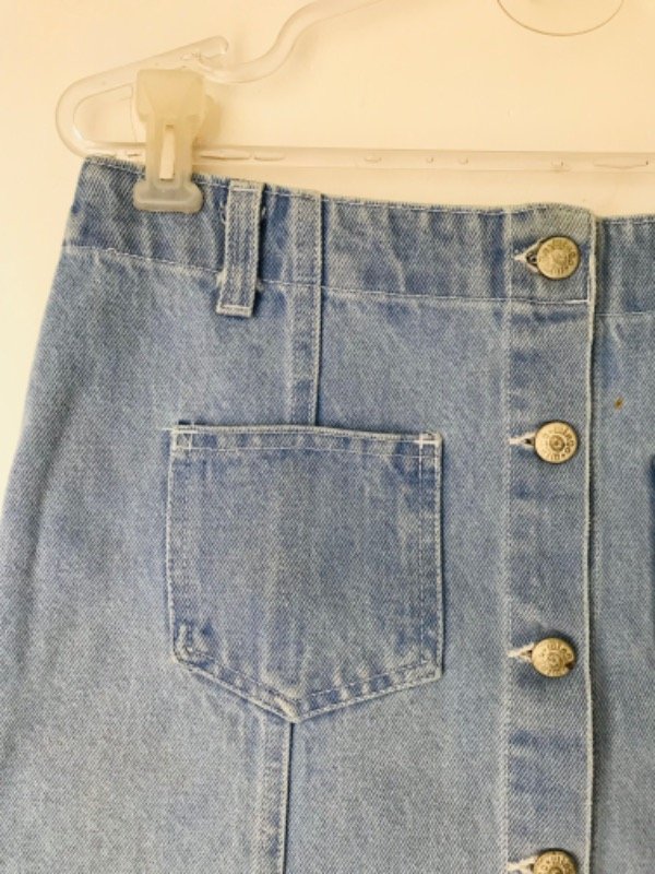 Mini falda de jean rígido vintage de botones con bolsillo, talle 4