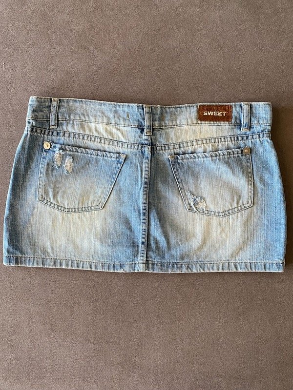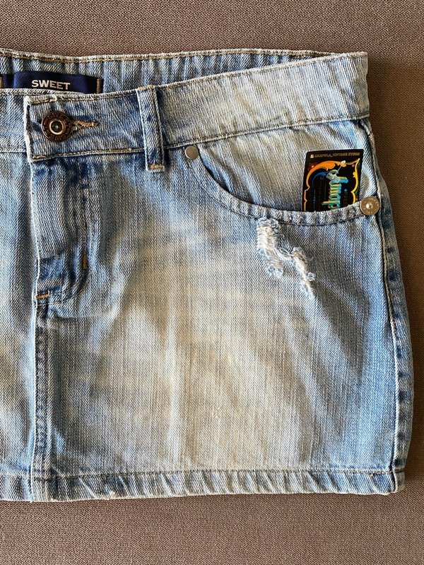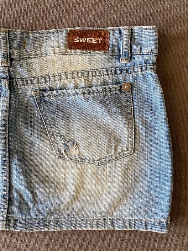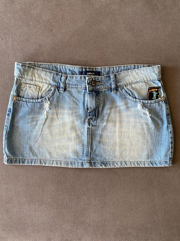 Mini flada de jean tiro bajo Sweet talle 32, celeste localizada y con roturas