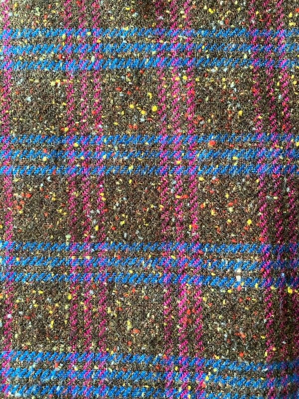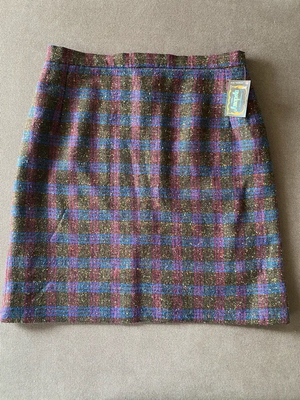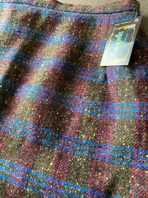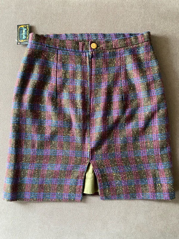 Mini falda vintage de paño escocés fondo grisáceo combinado con azul, fucsia ybun toque de amarillo, forrada, con cierre atras