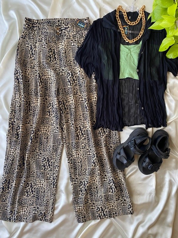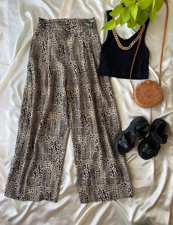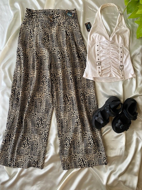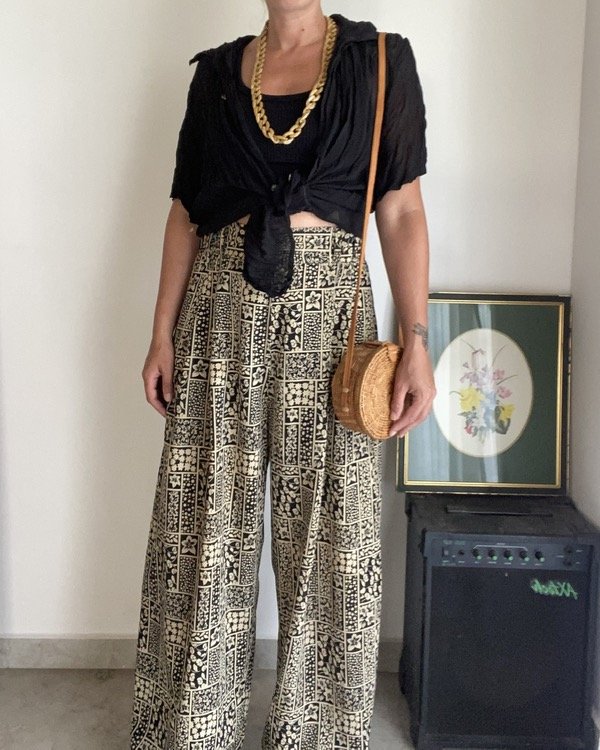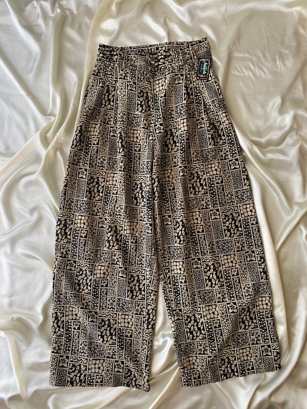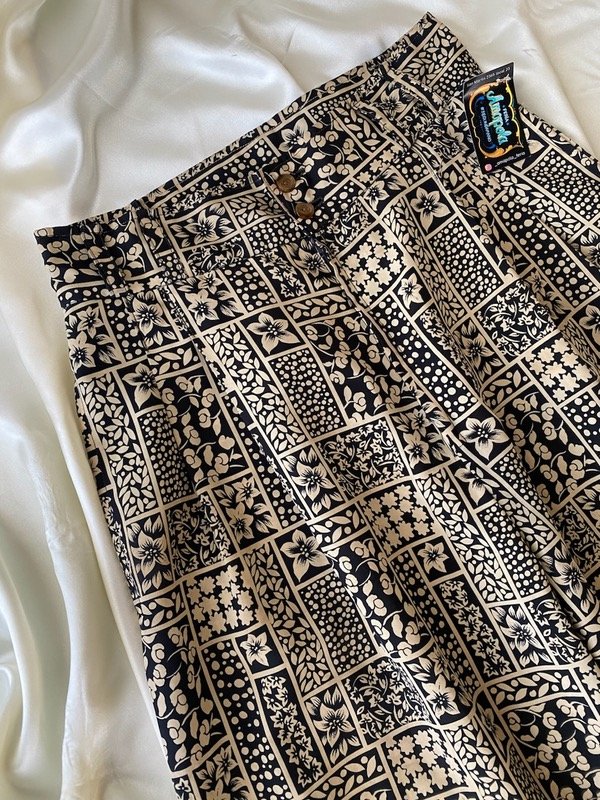 Medidas: contorno de cintura 72cm,, de cadera aprox hasta 120cm ( las pinzas dan mucha amplitud pero la tela tiene una caída perfecta) tiro 41cm, largo 110cm