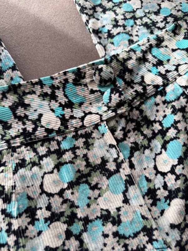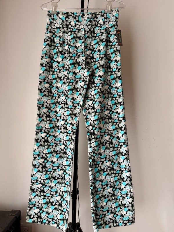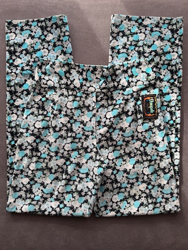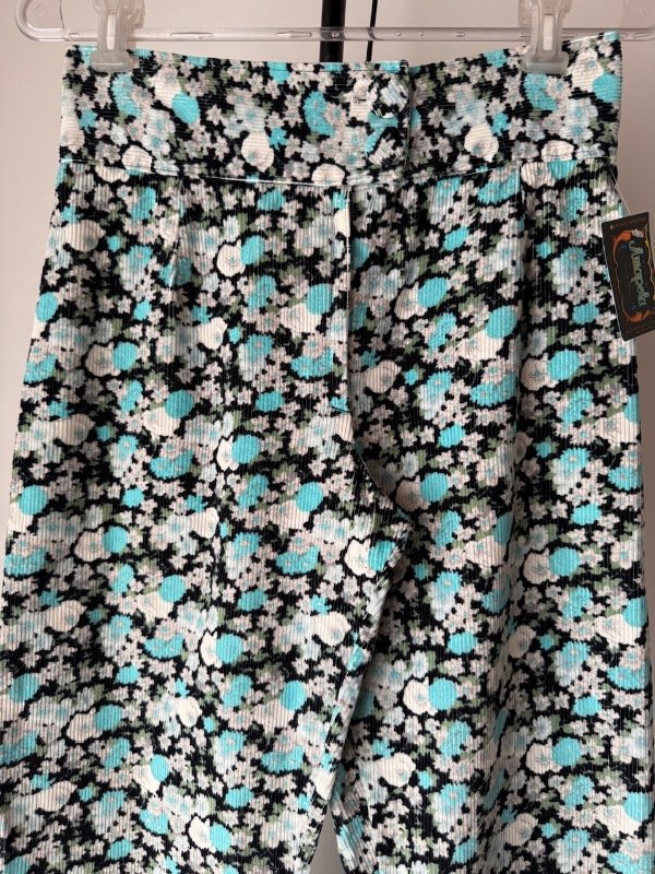 Pantalón de corderoy Vintage, es un corderoy de canelón finito floreado en negro blanco y turquesa, cintura ancha con 2 botones forrados 💕🥰💕
