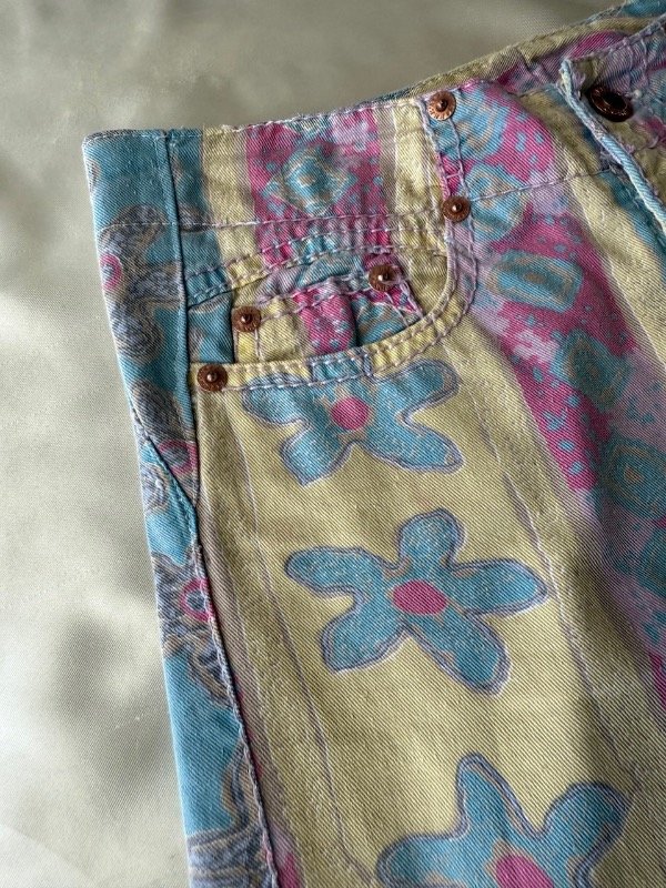 Este modelo es rígido pero de una lona liviana y con un print noventero hermoso alto de tiro y un calce increíble q le dan esas pinzas en la cola, botamanga semi oxford
