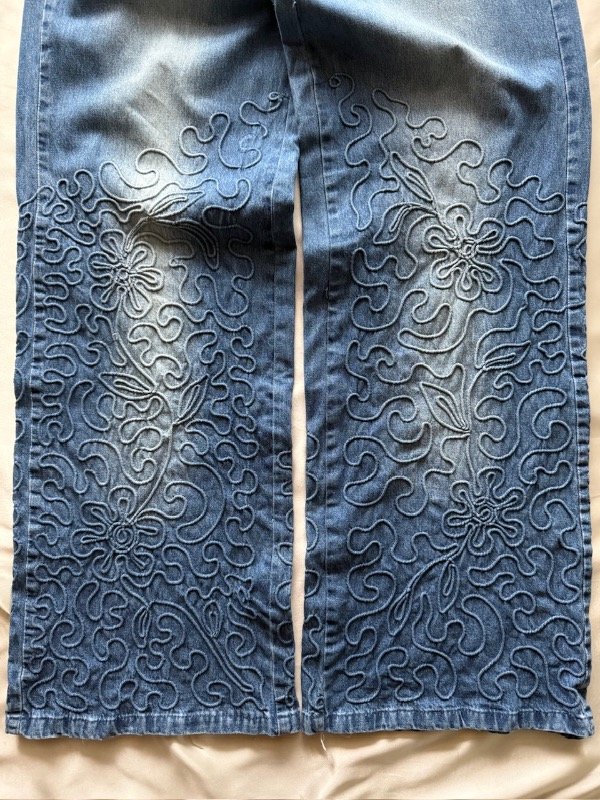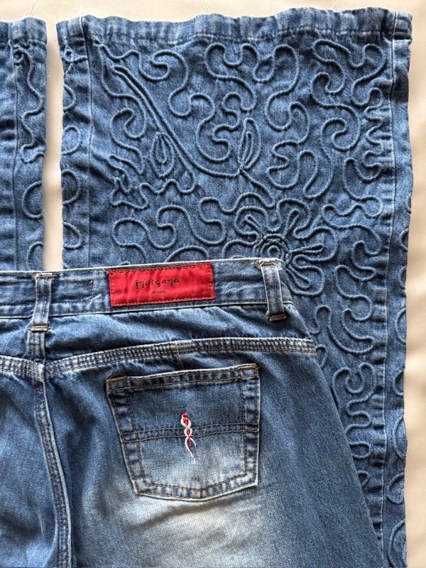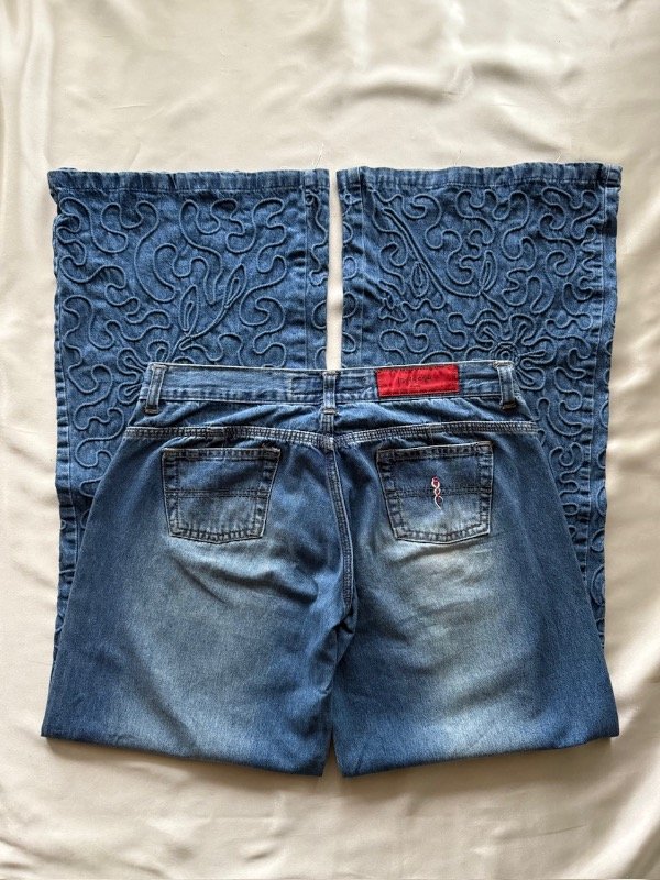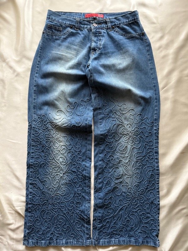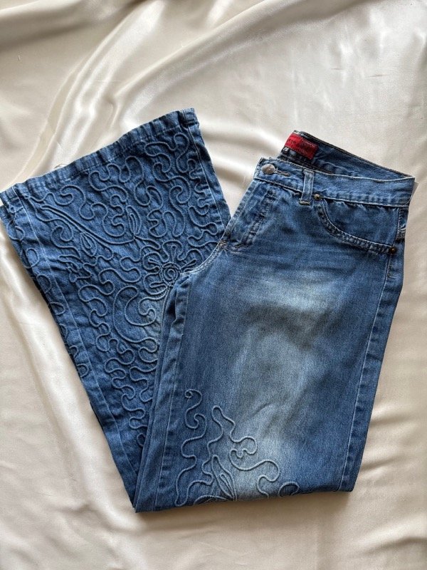 Jean y2k original de la época, tiro bajo, botamanga ancha y bordada, talle 28 según etiqueta 🏷️